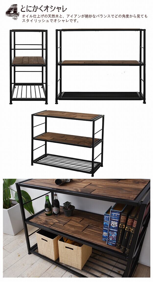 3段ラック 三段収納棚 収納ラック オープンラック 木製ラック シンプル モダン 天然木 モザイク インテリア ウッド 木 北欧 木製 アイアン オイル アンティーク調 90cm幅 シェルフ 収納家具 おしゃれ 植物性オイル 塗装 スタイリッシュ ナチュラル
