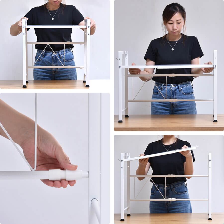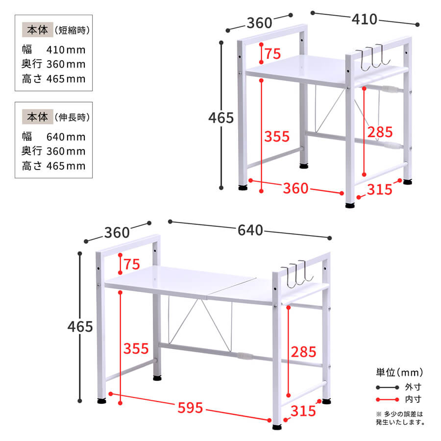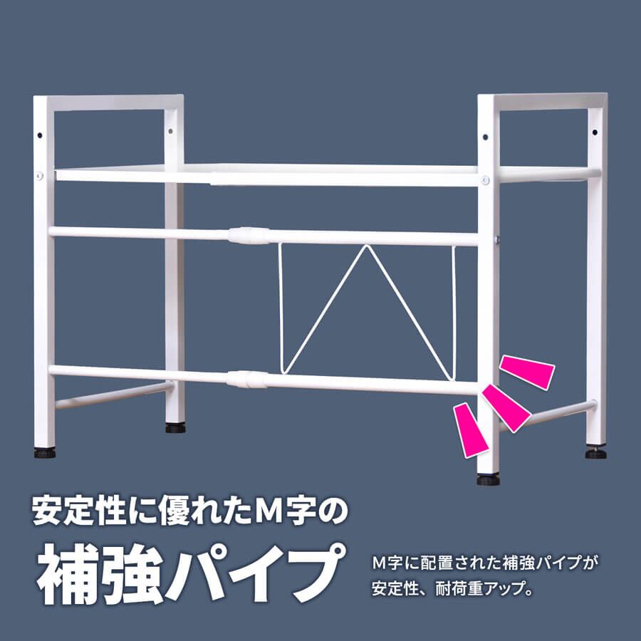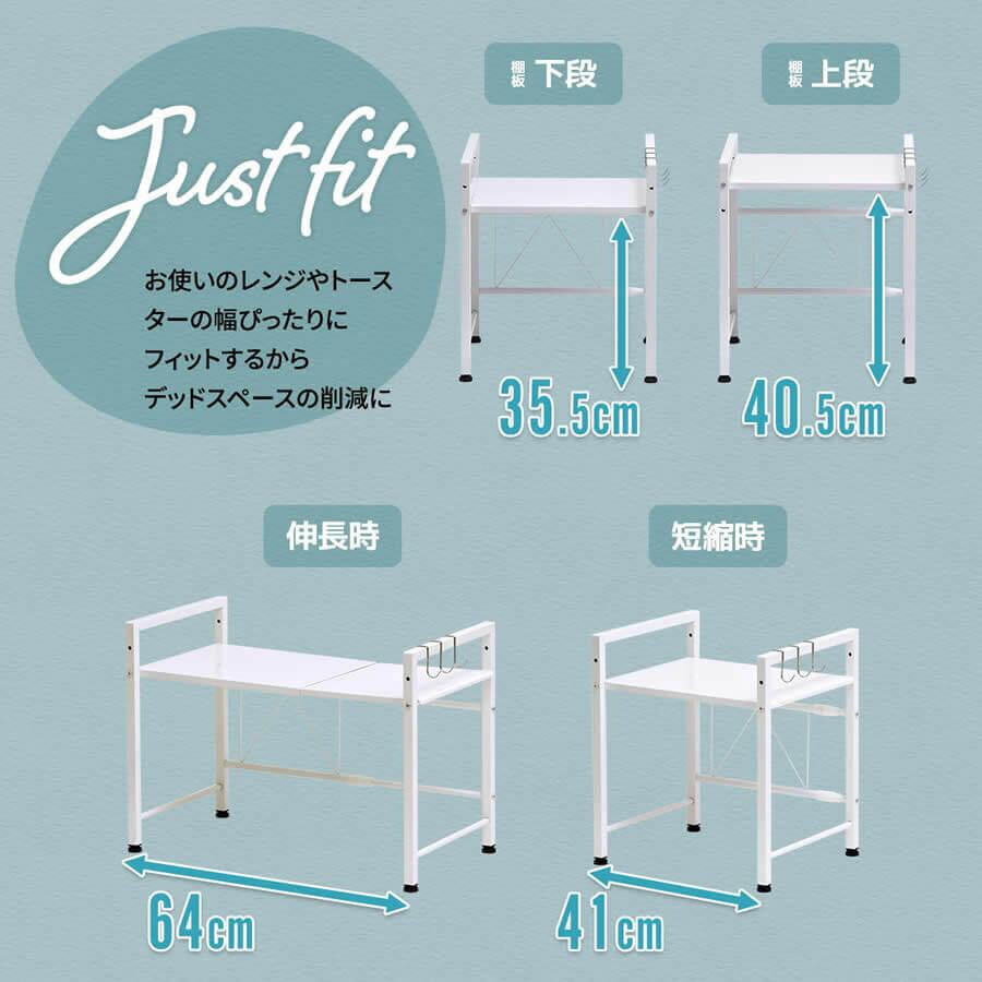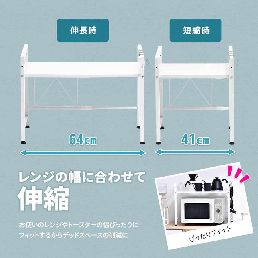 棚の高さは2段階調整が可能で、幅は(約)41cm〜64cmまで伸縮するので、置きたいところやお手持ちの家電のサイズに合わせて設置場所を調節することが可能です。