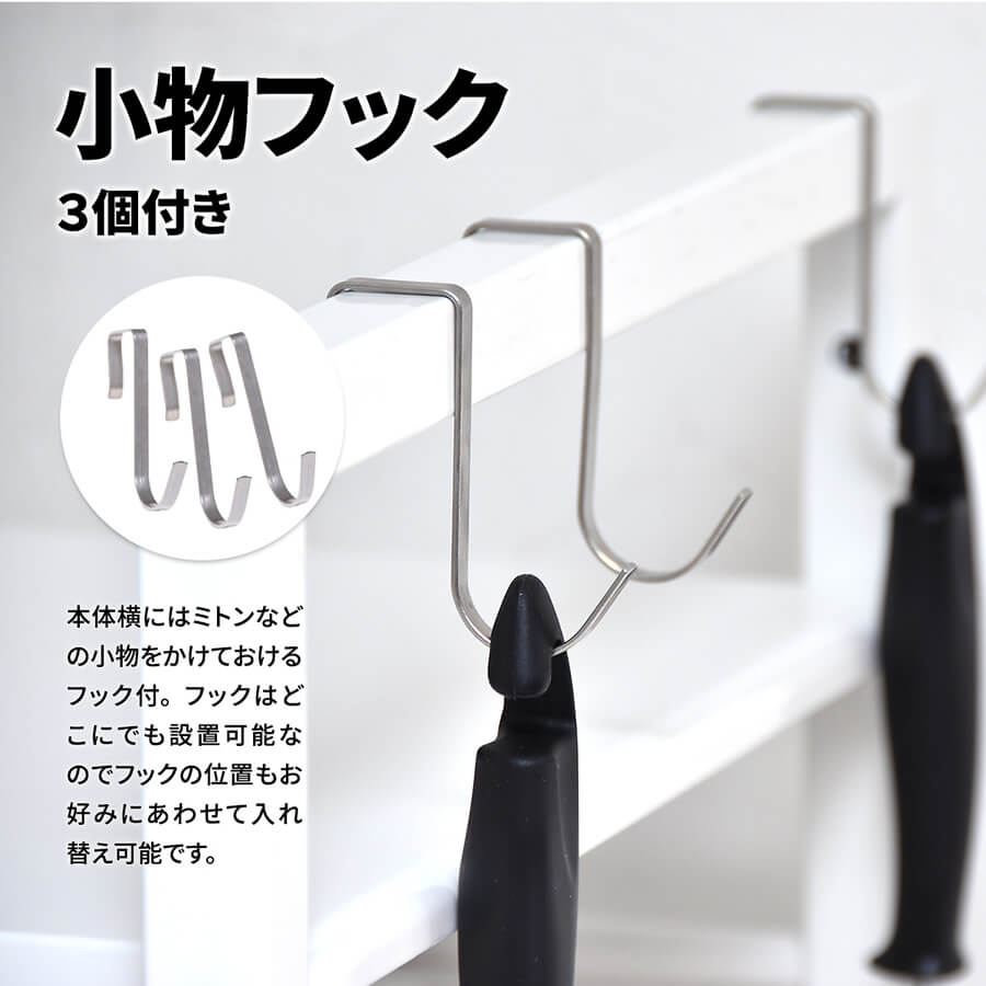 本体横にはミトンなど、キッチン小物をちょっとかけておけるように、付属品として小物用フックが3個付いています。