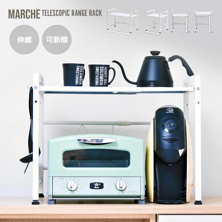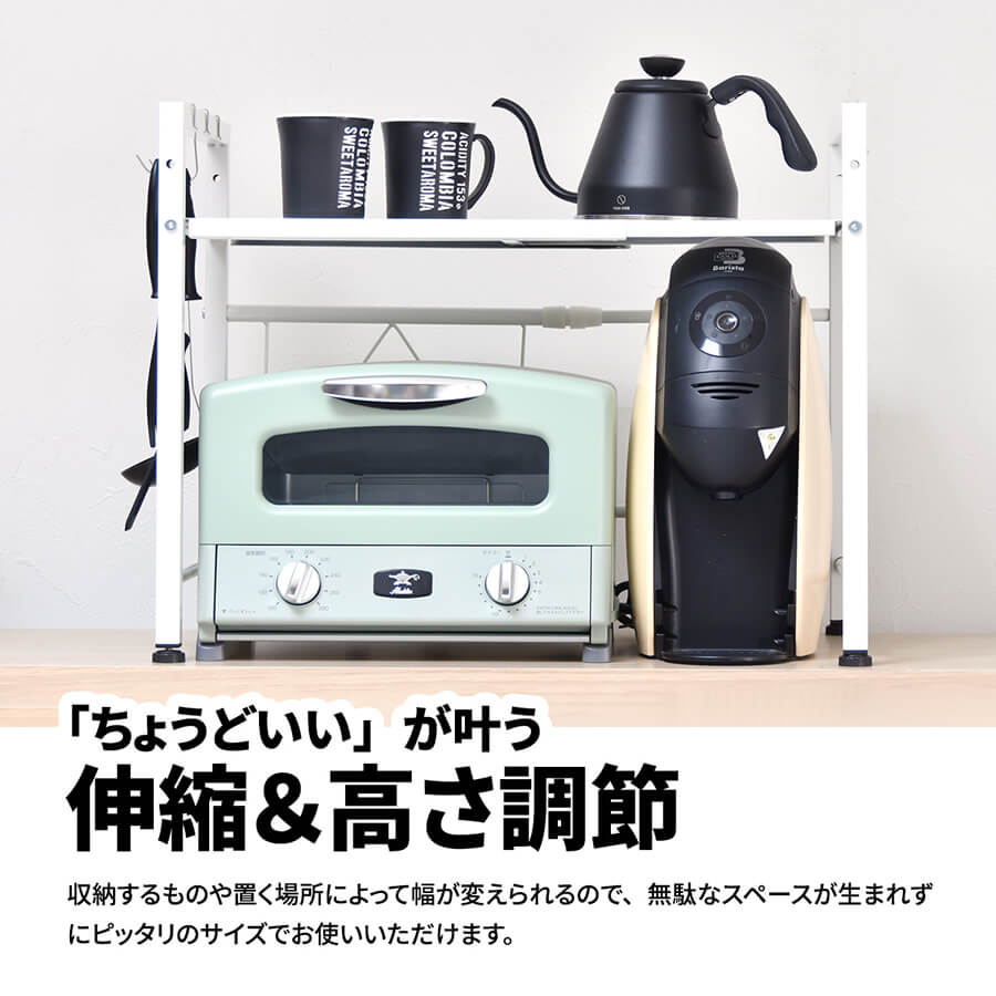 スペースを取りがちなレンジ台上の家電まわりのデッドスペースをすっきりと見せてくれる伸縮タイプのレンジラックです。
