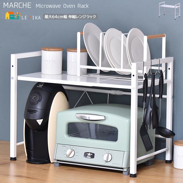 伸縮式キッチン収納ラック 41cm幅 最大64cm幅 ホワイト 白 レンジ台上収納 キッチン用品収納 レンジラック 幅41cm 最大幅64cm 奥行36cm 高さ 46.5cm 可動棚 おすすめ おしゃれ 北欧 モダン スタイリッシュ スチール製 キッチン家電収納 デッドスペース活用 収納棚 ラック