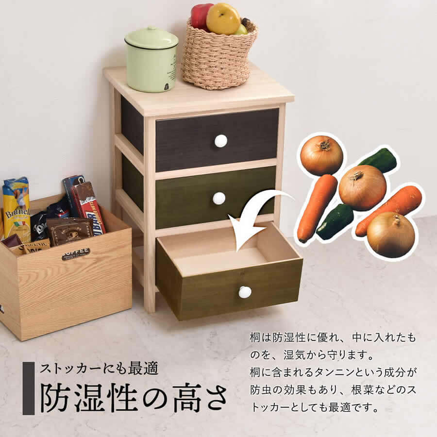本体から引き出しまで桐で作られているので、衣類はもちろん、紙や根菜などの保管にも向いています。