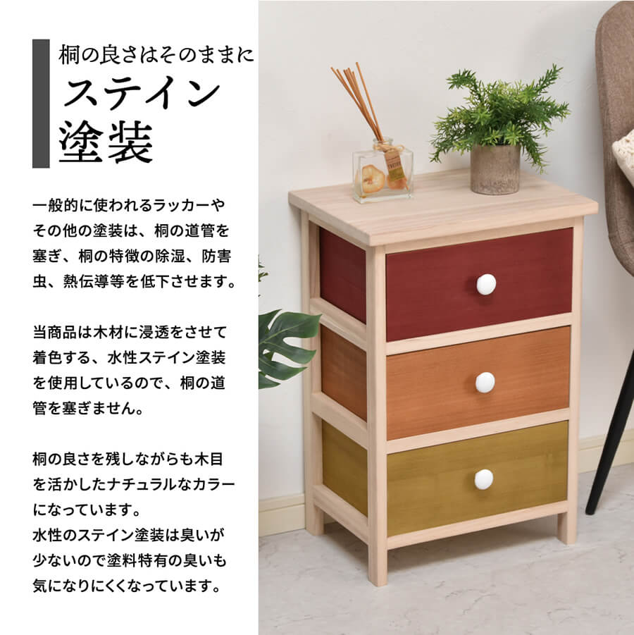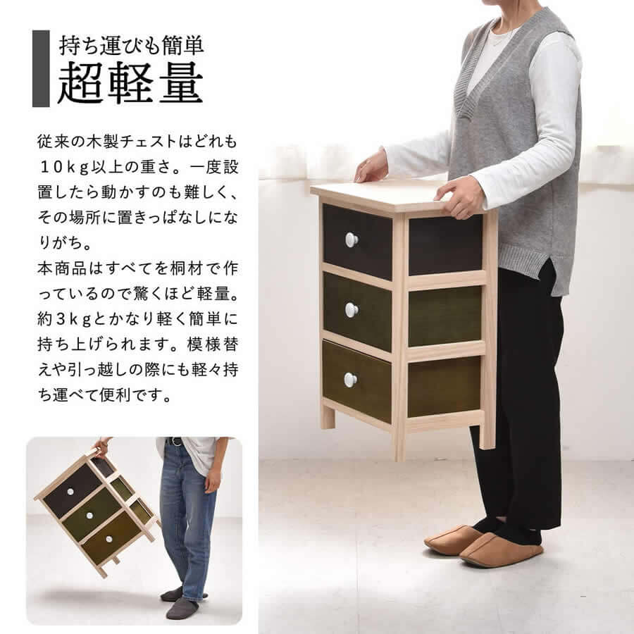 軽量で素材感を生かした桐でできた3段チェストです。