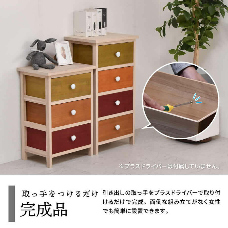 面倒な本体の組み立てなどはなく、引出しの取っ手をプラスドライバーで取り付けるだけで完成します。(プラスドライバーは付属しておりませんので、お客様にてご用意ください。)
