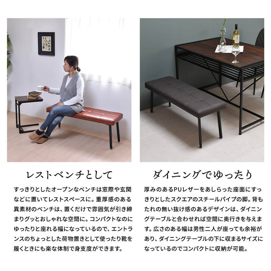 ダイニングベンチ 背もたれ無しベンチ 背もたれ無し椅子 2人掛けベンチ 合皮ベンチ 合成皮革 ブラウン ダークグレー おすすめ おしゃれ 北欧 モダン スタイリッシュ ヴィンテージ調 ダイニング用ベンチ 二人掛けベンチ レストベンチ 玄関ベンチ 室内ベンチ リビングベンチ 室内用ベンチ
