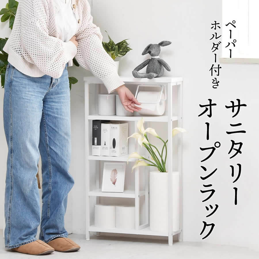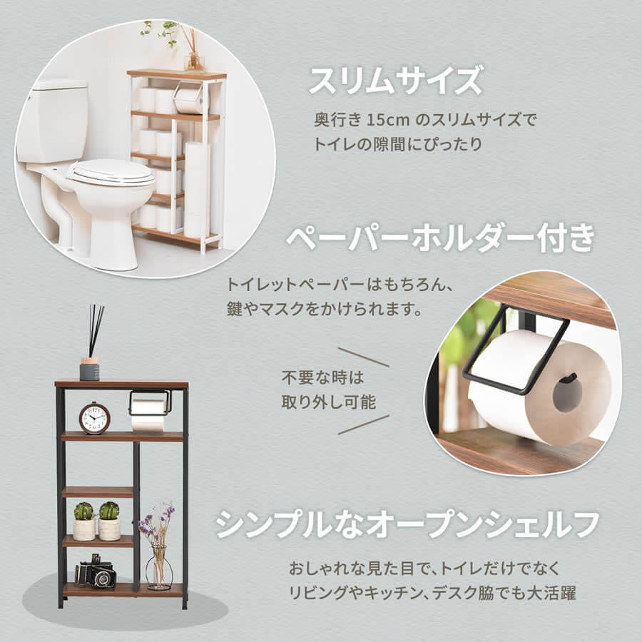 トイレ収納ラック サニタリーラック リビングラック キッチン収納ラック 玄関ラック トイレットペーパーホルダー付き収納ラック オープンシェルフ リビングシェルフ おすすめ おしゃれ 北欧 モダン スタイリッシュ コンパクト 省スペース 薄型 オープン収納ラック 収納棚 トイレットペーパーホルダー取り外し可能 収納シェルフ