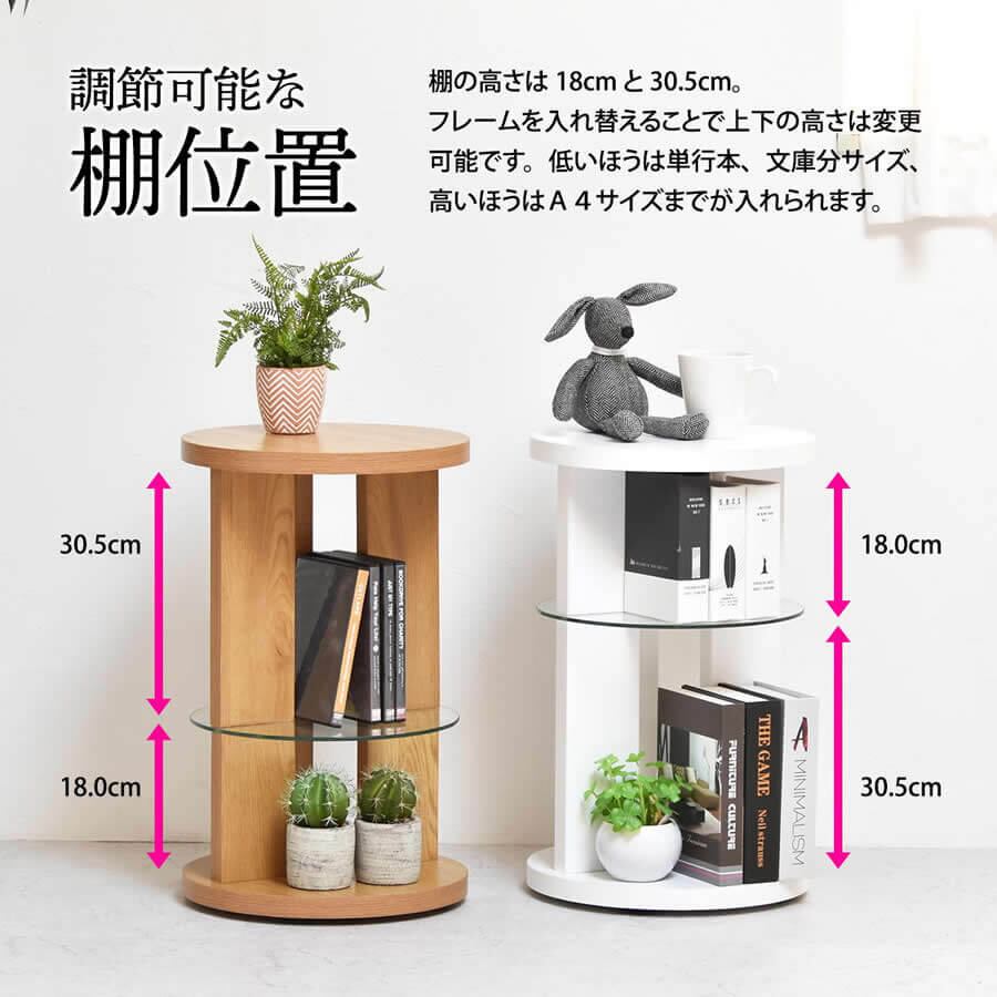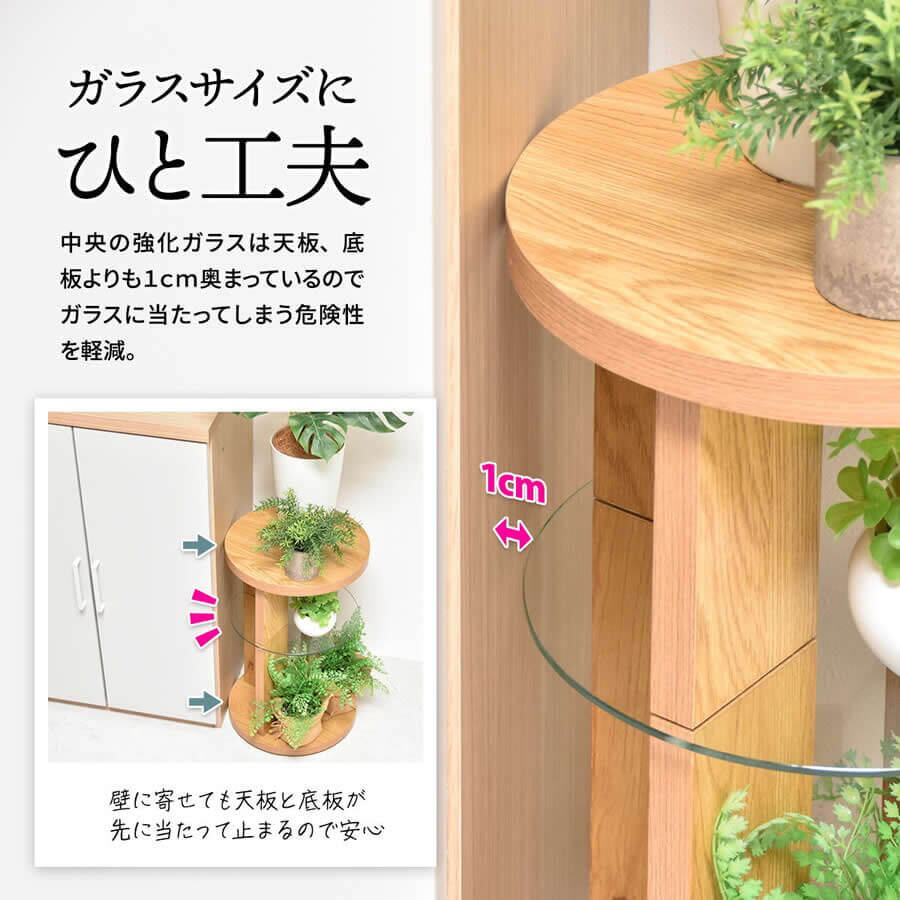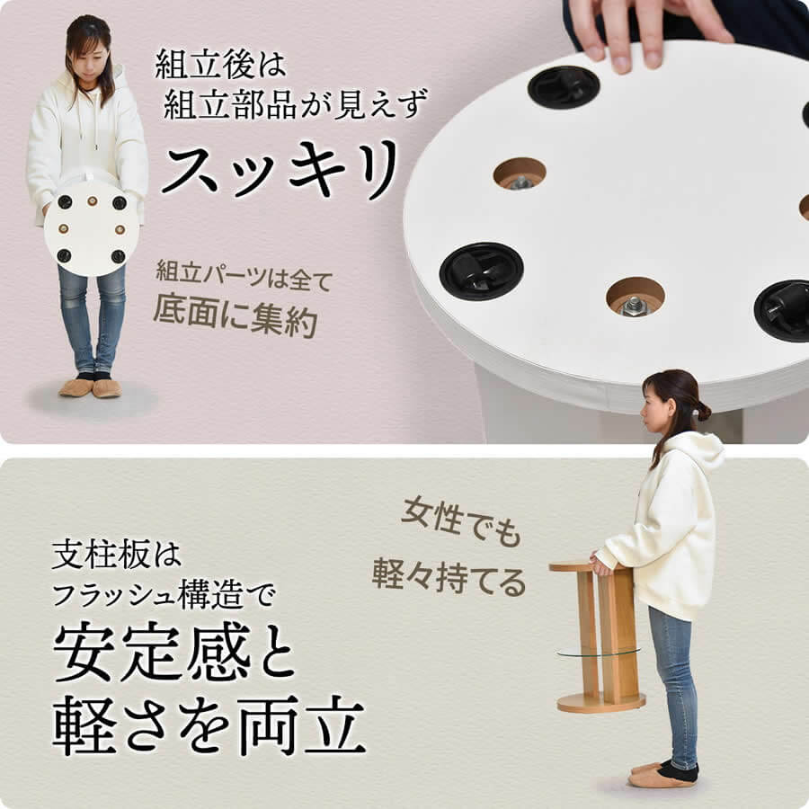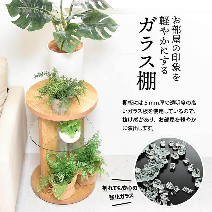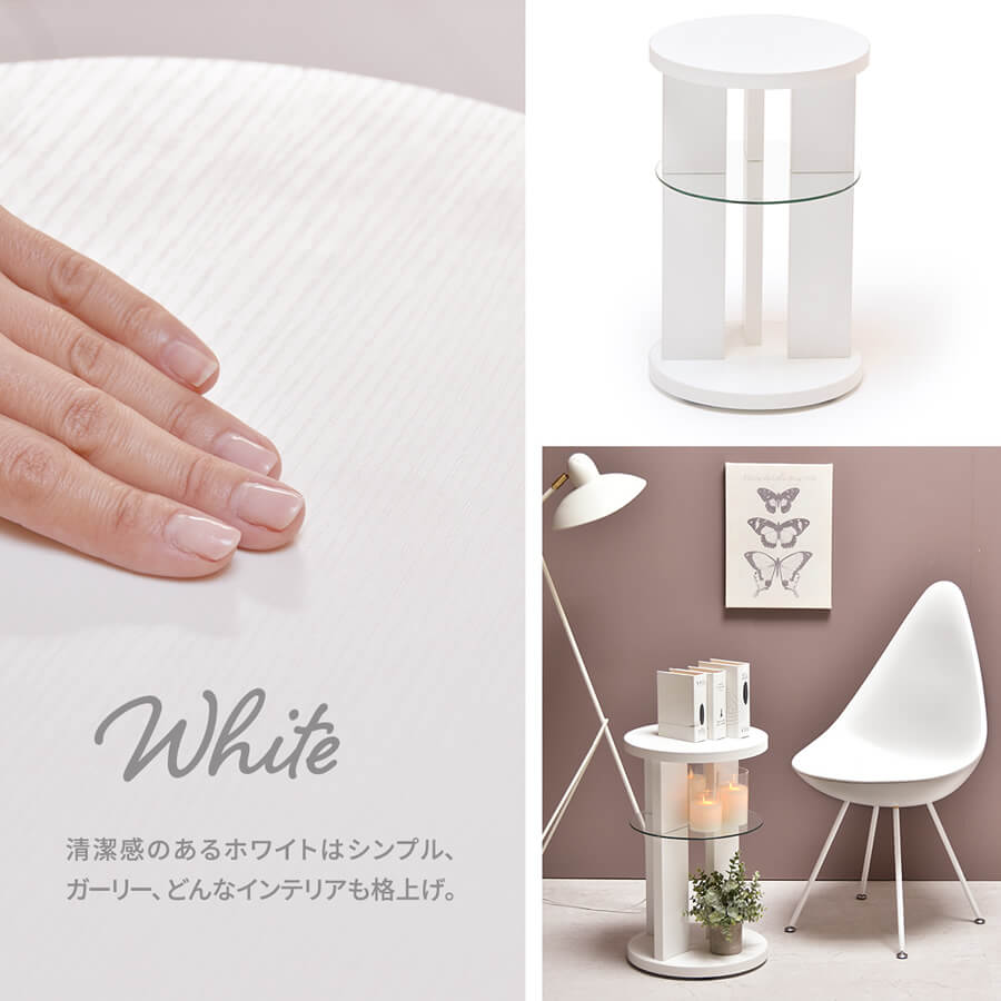 中棚板には透明感のある強化ガラスを採用しており、中央に空間をあけることで抜け感のある印象の円形テーブルです。