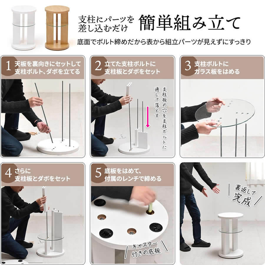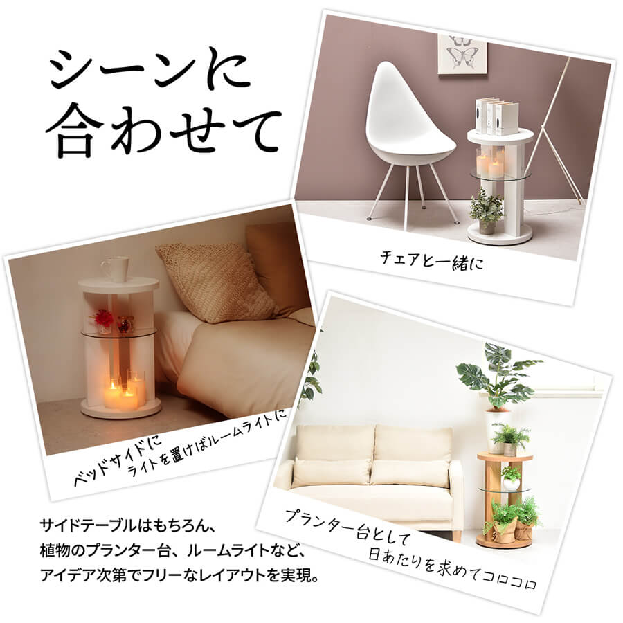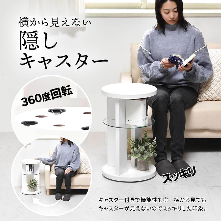 サイドテーブル 円形テーブル 34cm幅 丸形テーブル 円型テーブル 丸型テーブル ガラス棚板 ガラステーブル キャスター付きテーブル おすすめ おしゃれ 北欧 モダン スタイリッシュ ナチュラル ホワイト ベッド横テーブル ソファ横テーブル デスク横テーブル ベッドサイドテーブル ソファサイドテーブル 机 テーブル