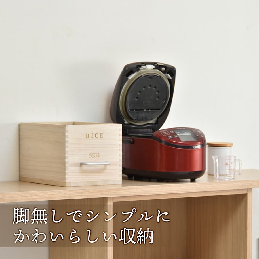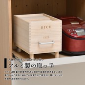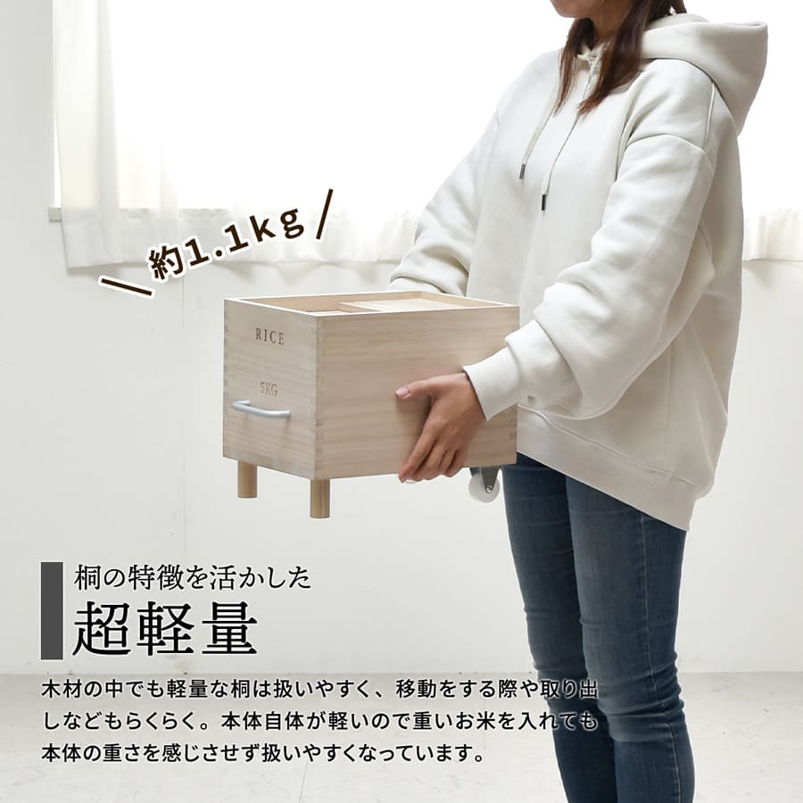 素材は桐を使用しており、桐の米びつは、調湿機能に優れており、米びつ内の湿度を一定に保ちやすく、さらに防腐、防虫効果もあるのでお米の保存に適した素材です。