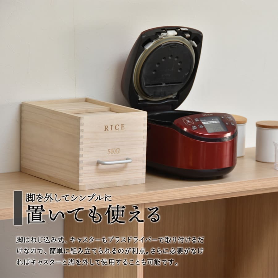 桐の米びつに取っ手とキャスターを付けた使いやすさにもこだわった容量5kgタイプのキャスター付き米びつです。