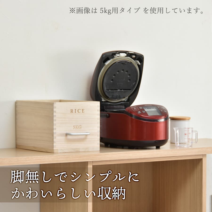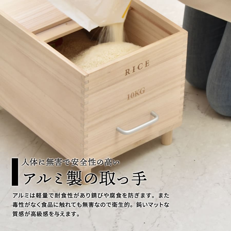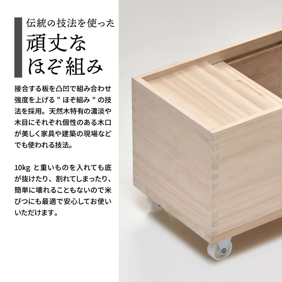 素材は桐を使用しており、桐の米びつは、調湿機能に優れており、米びつ内の湿度を一定に保ちやすく、さらに防腐、防虫効果もあるのでお米の保存に適した素材です。