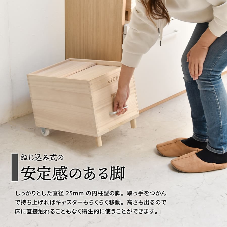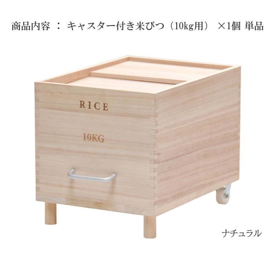 桐の米びつに取っ手とキャスターを付けた使いやすさにもこだわった容量10kgタイプのキャスター付き米びつです。