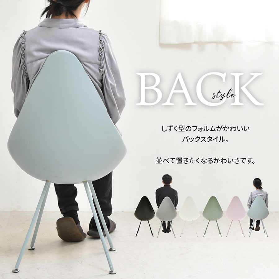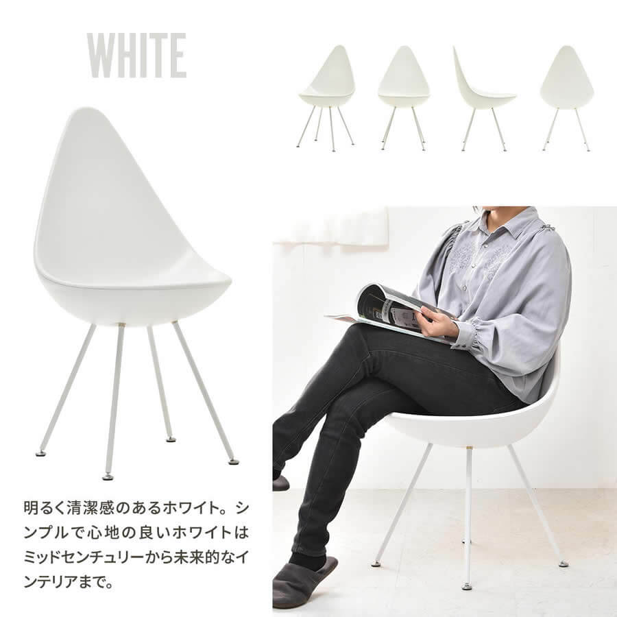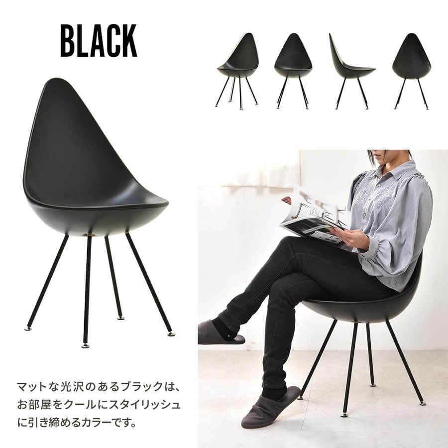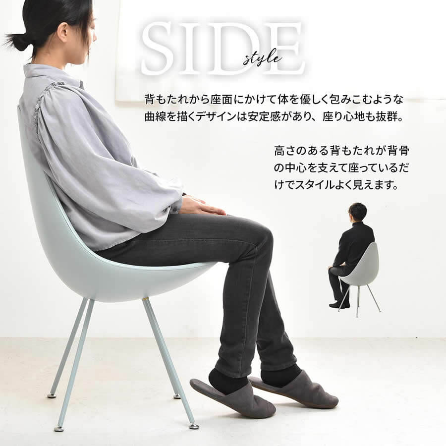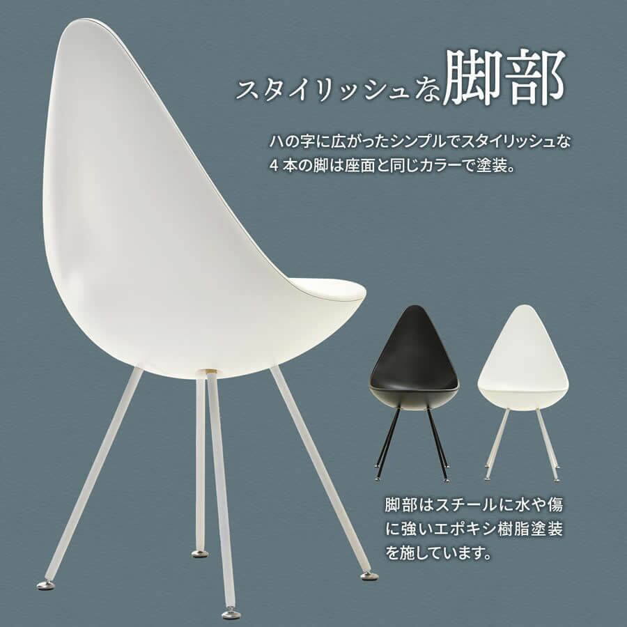 座面と背もたれは体にフィットするように設計された滑らかなドロップ型の曲線で、ハの字の脚部で安定性も良くデザイン性にも優れたチェアです。