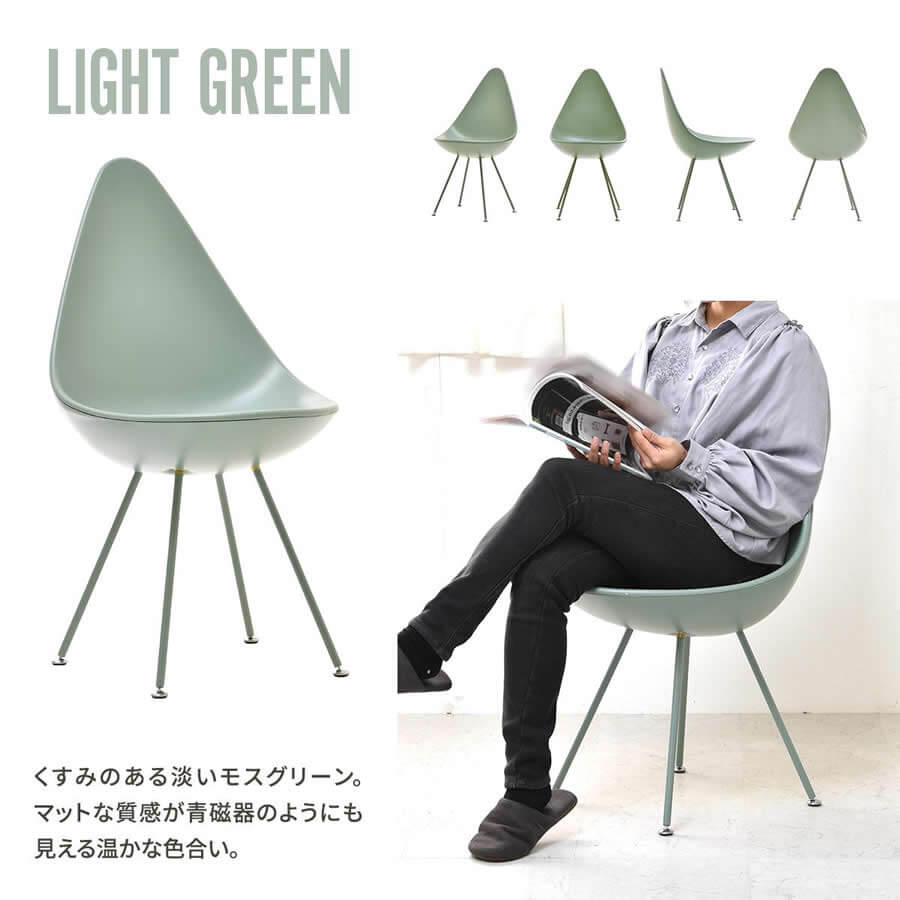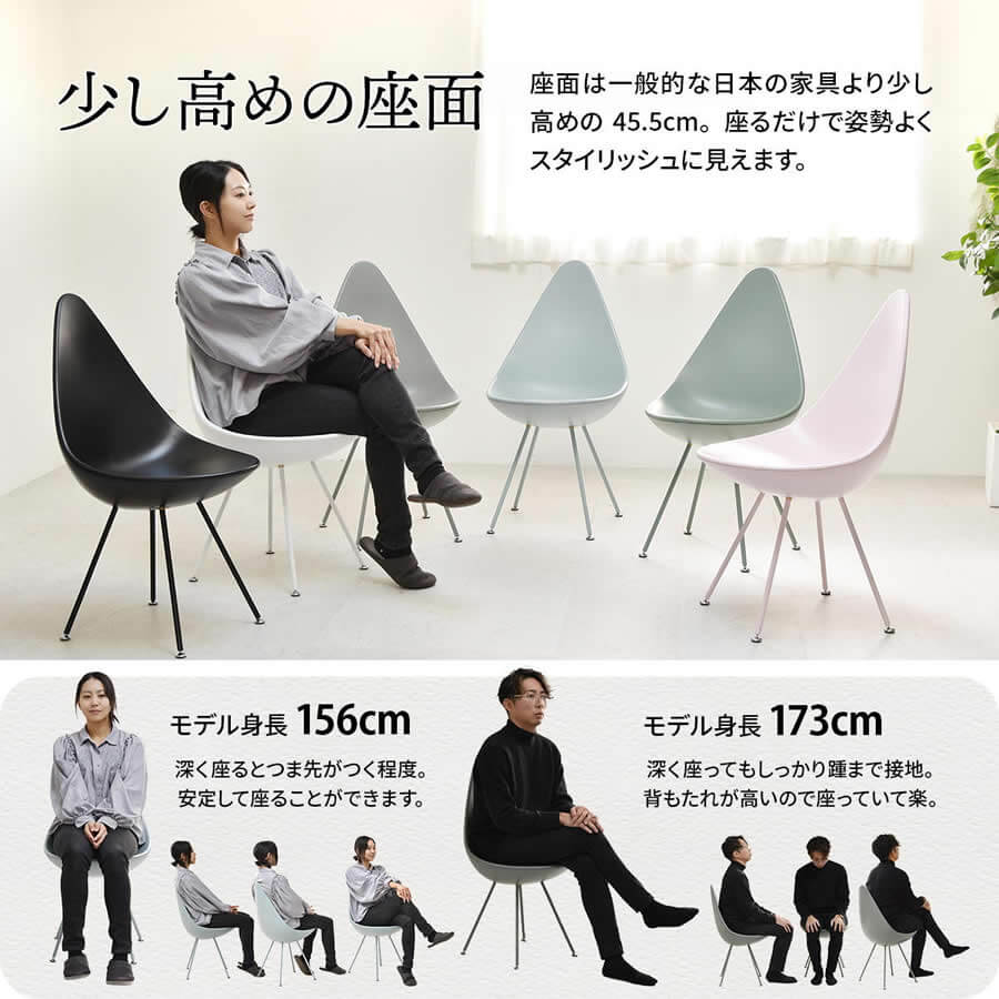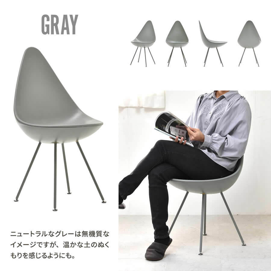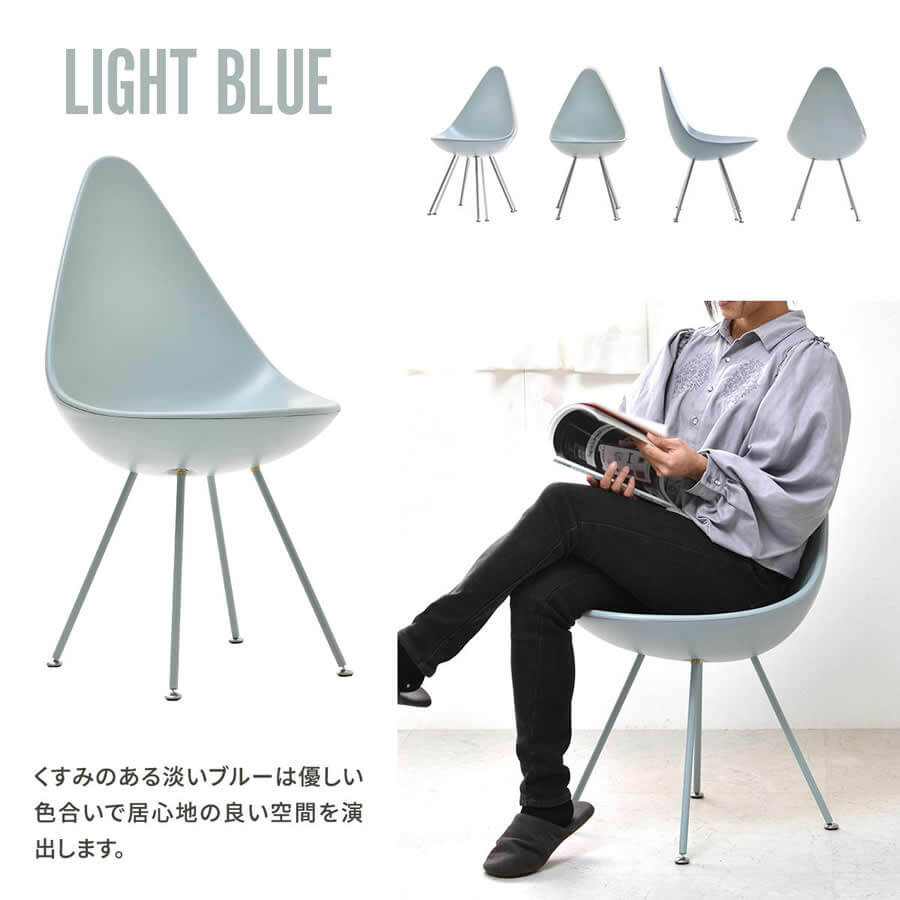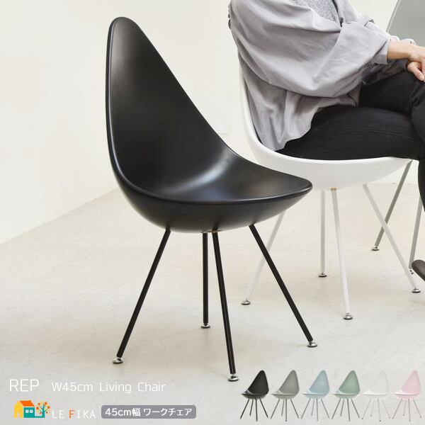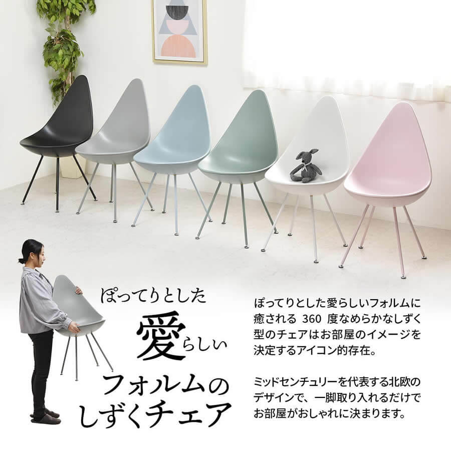 座面と背もたれは体にフィットするように設計された滑らかなドロップ型の曲線で、ハの字の脚部で安定性も良くデザイン性にも優れたチェアです。