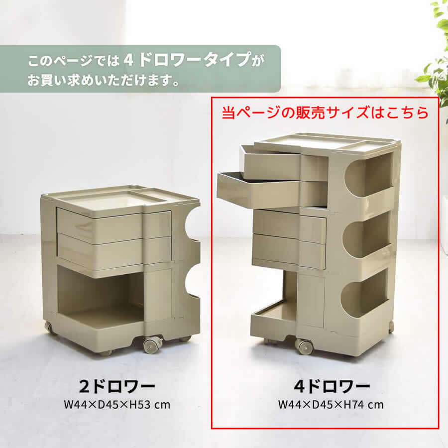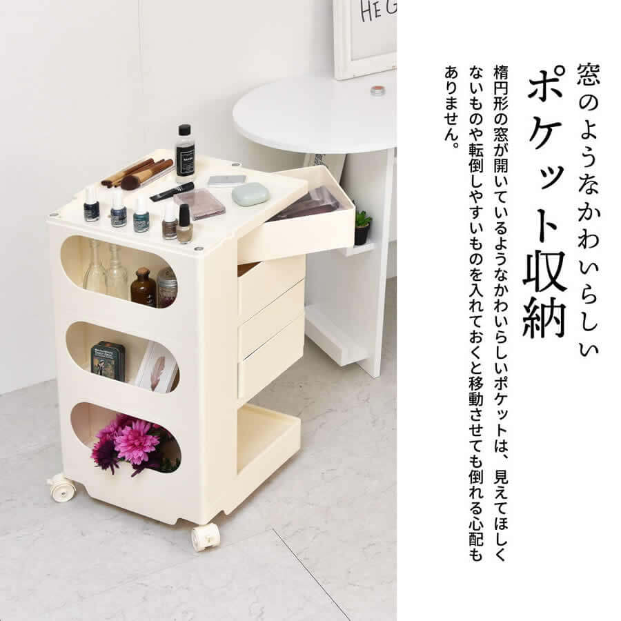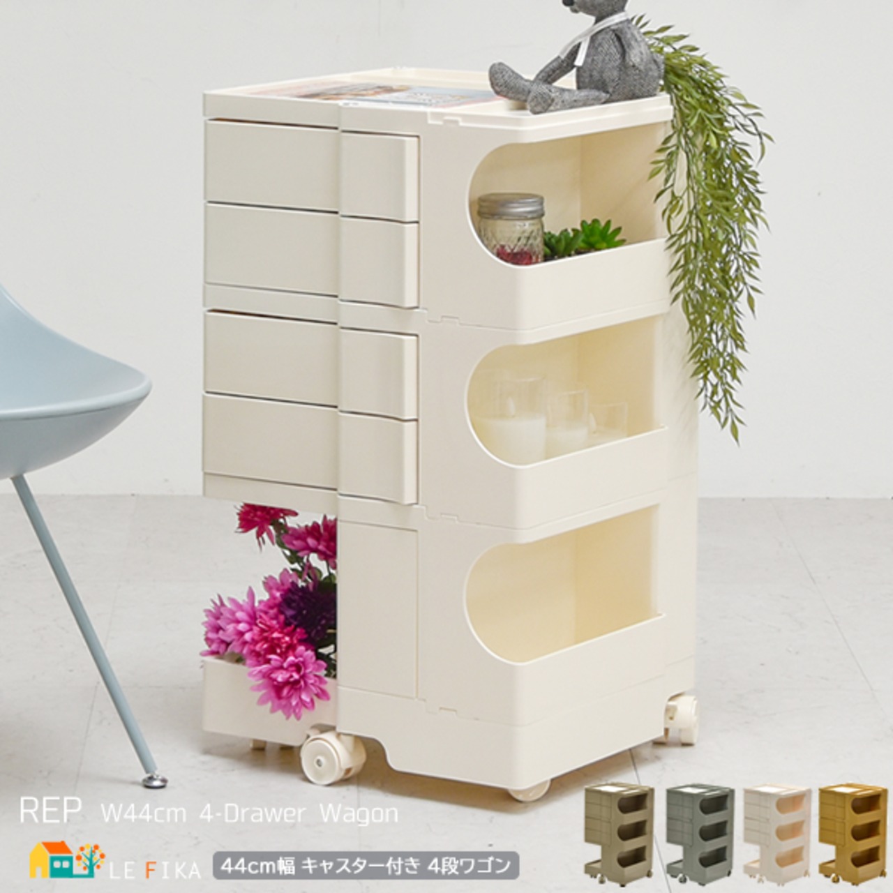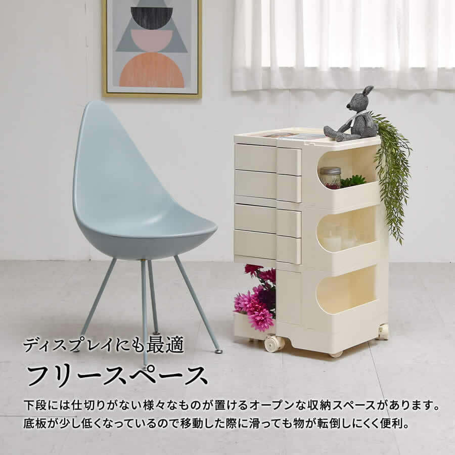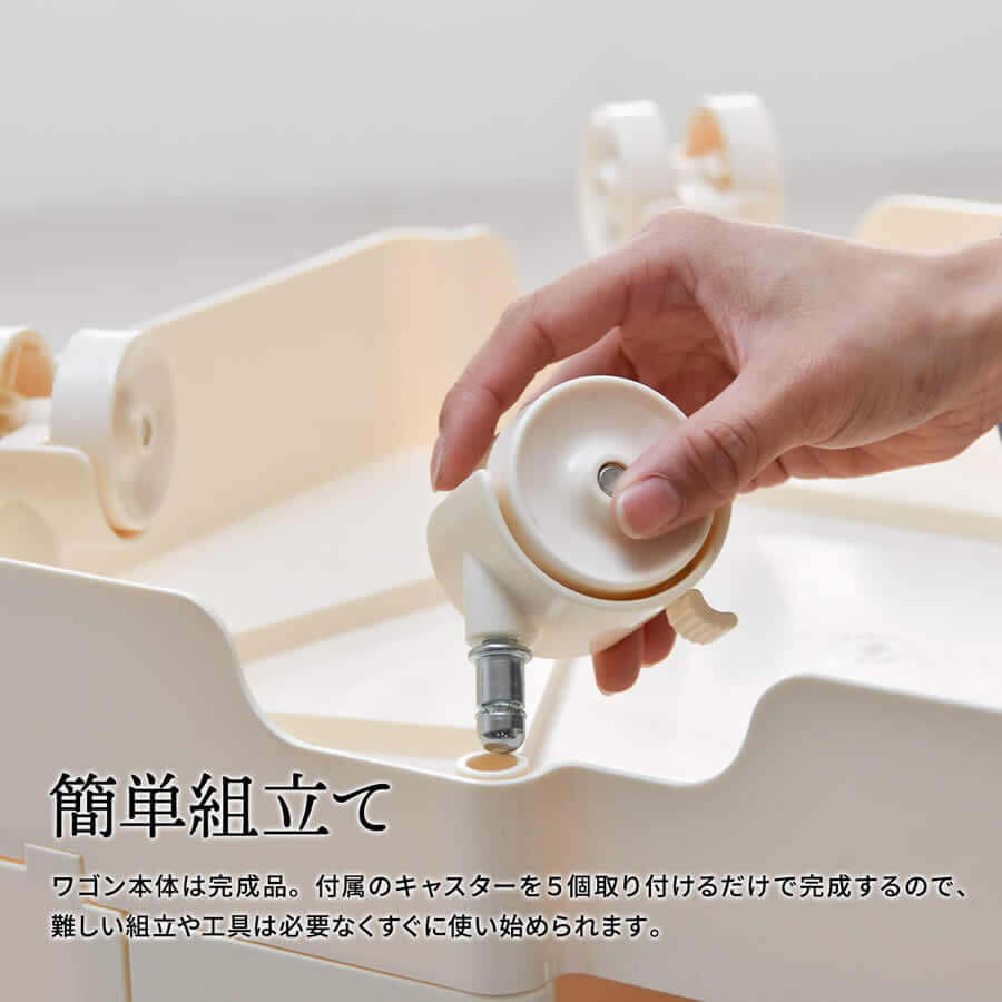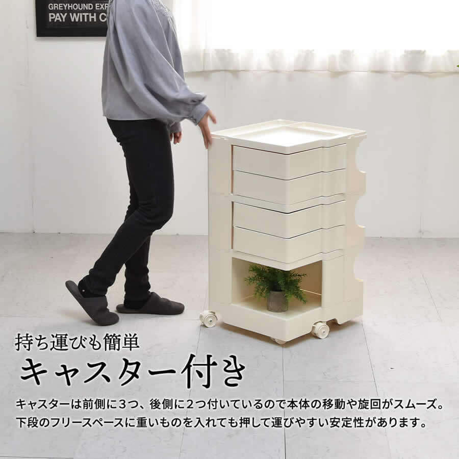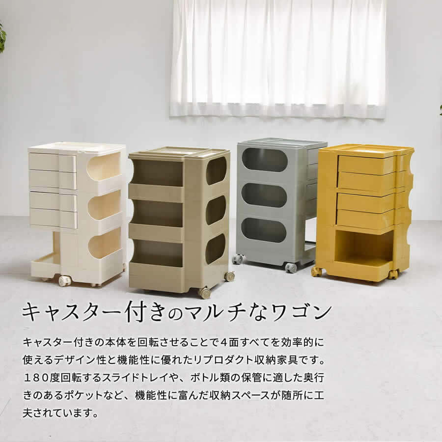 キャスター付きの本体を回転させることで側面4面すべてを効率的に使える4ドロワータイプの収納ワゴンです。