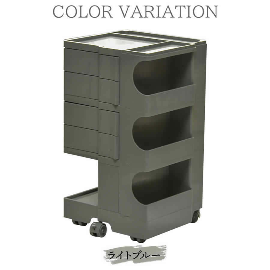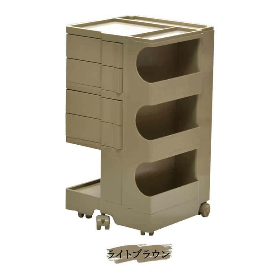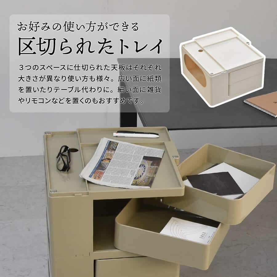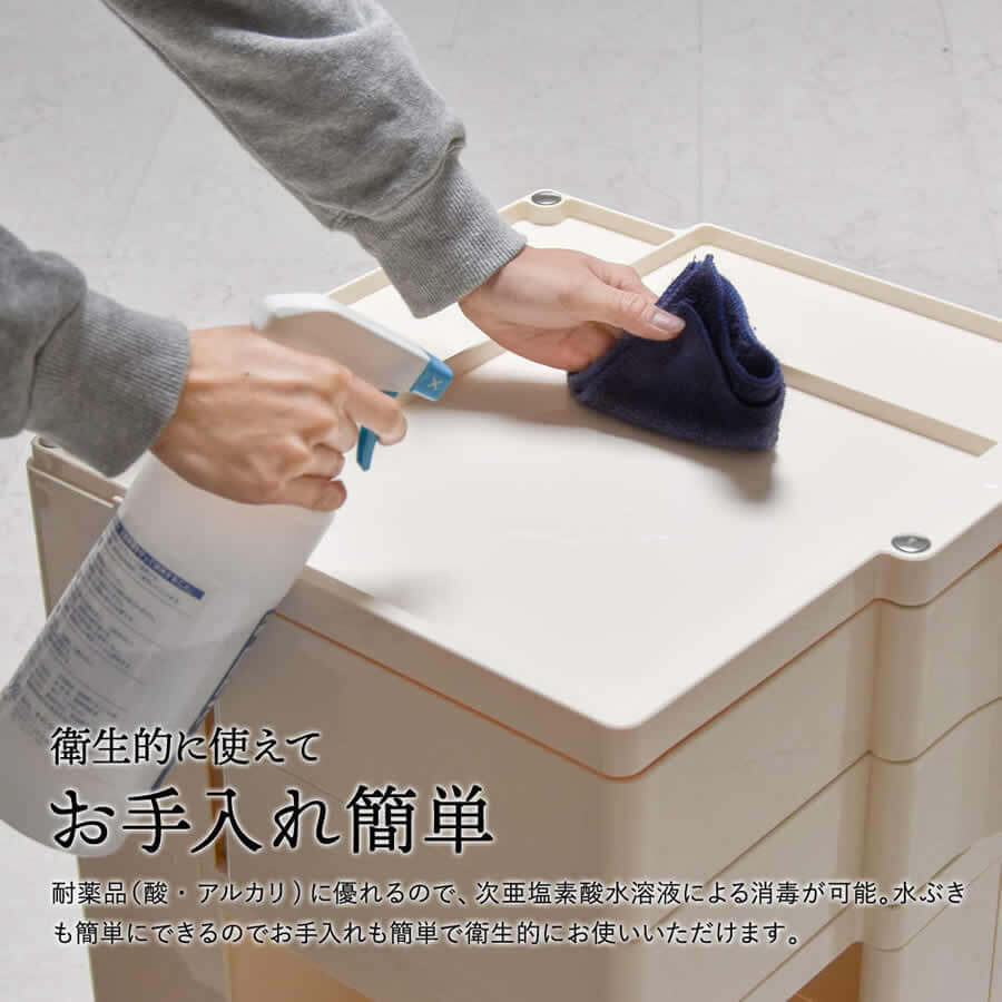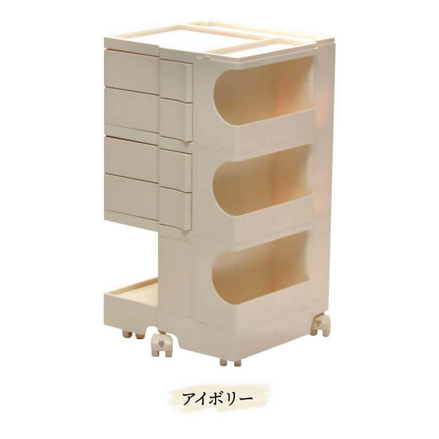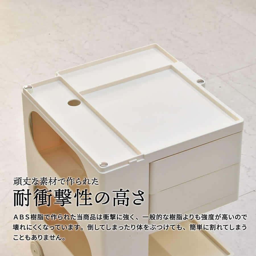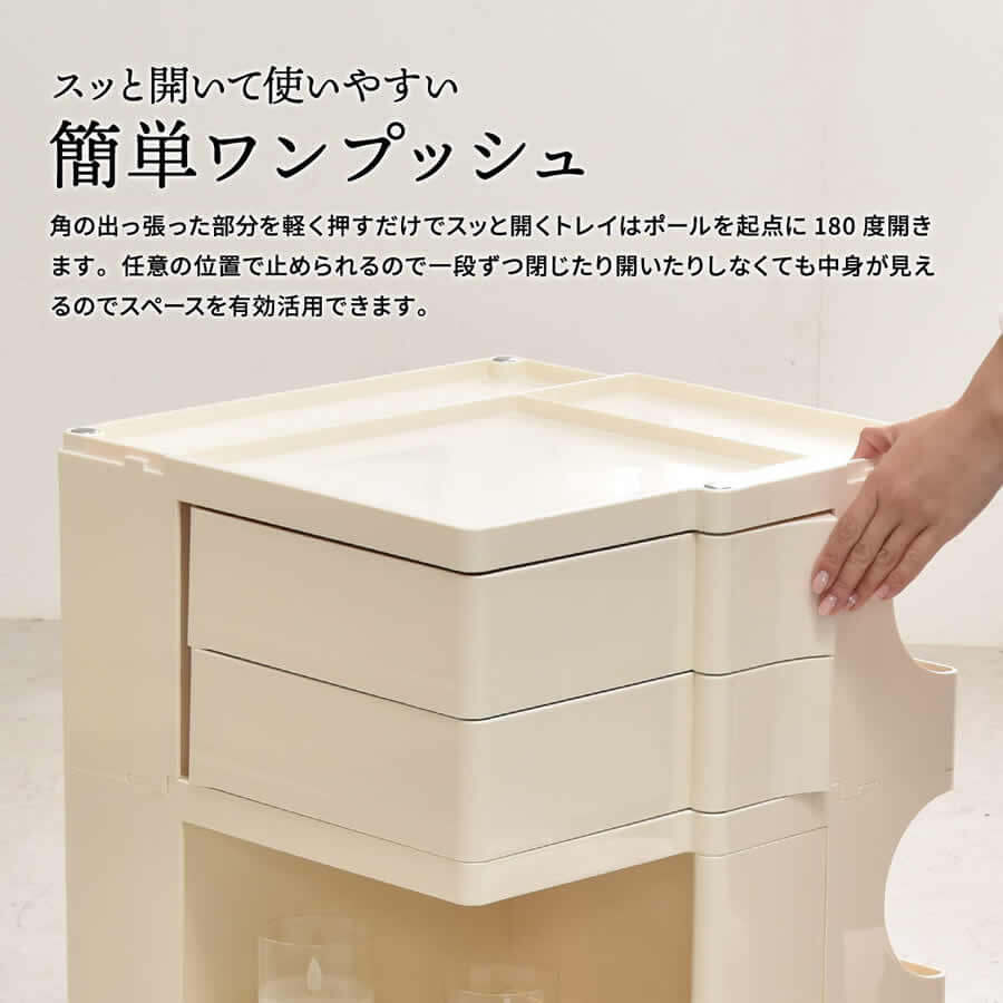 キャスター付きの本体を回転させることで側面4面すべてを効率的に使える4ドロワータイプの収納ワゴンです。
