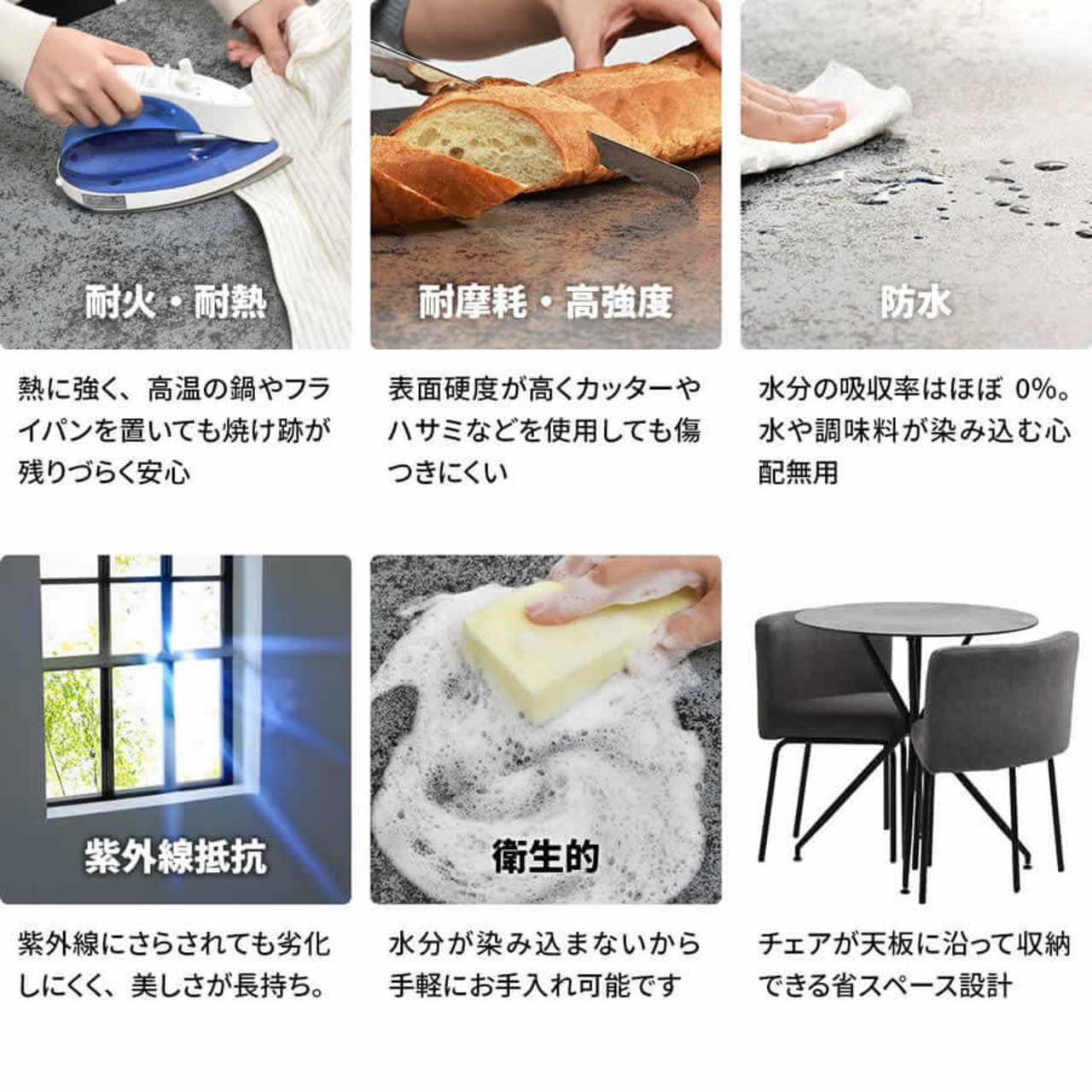 テーブル天板には強化ガラスの表面にセラミックが焼き付けられており、耐火性、耐熱性、防水性、表面硬度などに非常に優れているダイニングテーブルです。