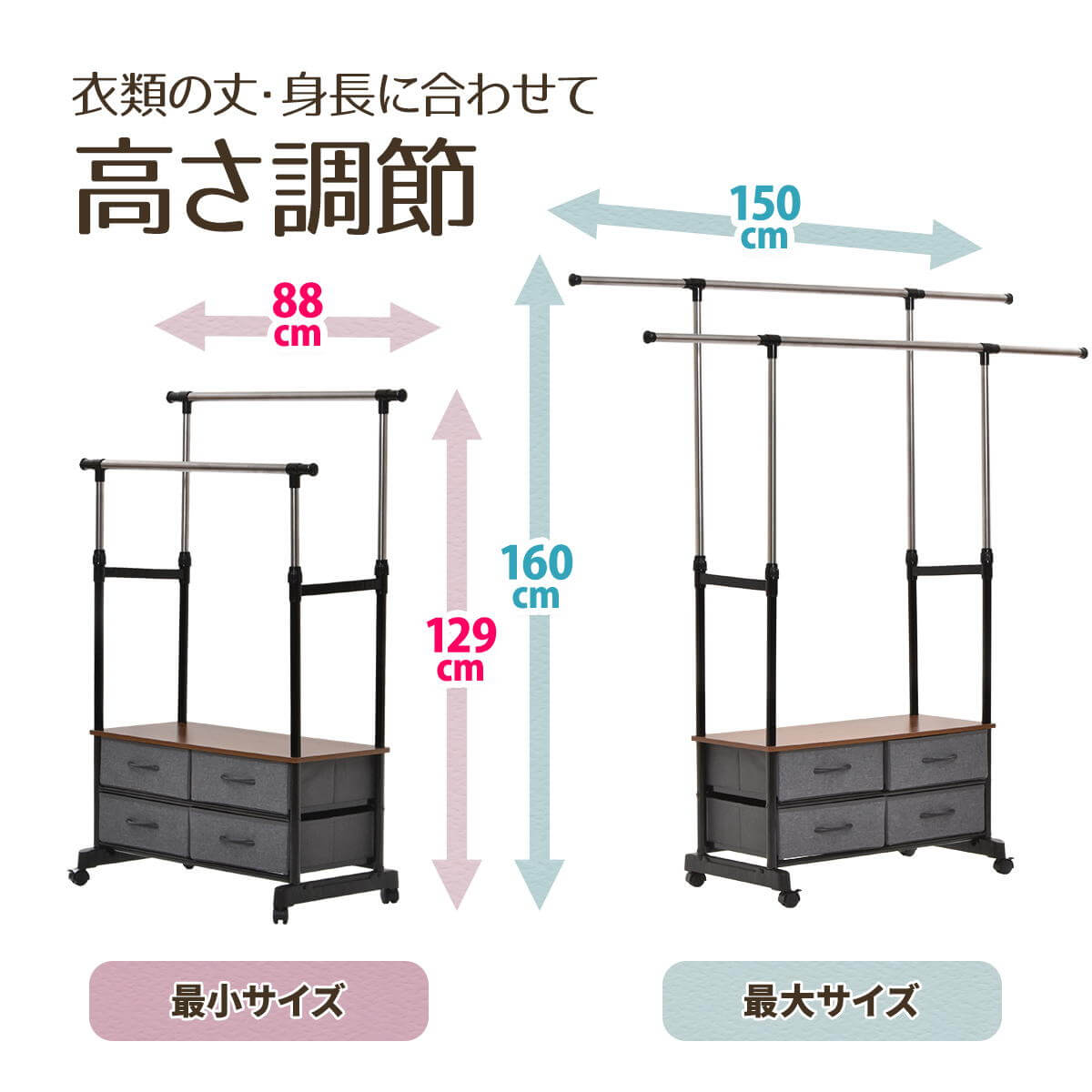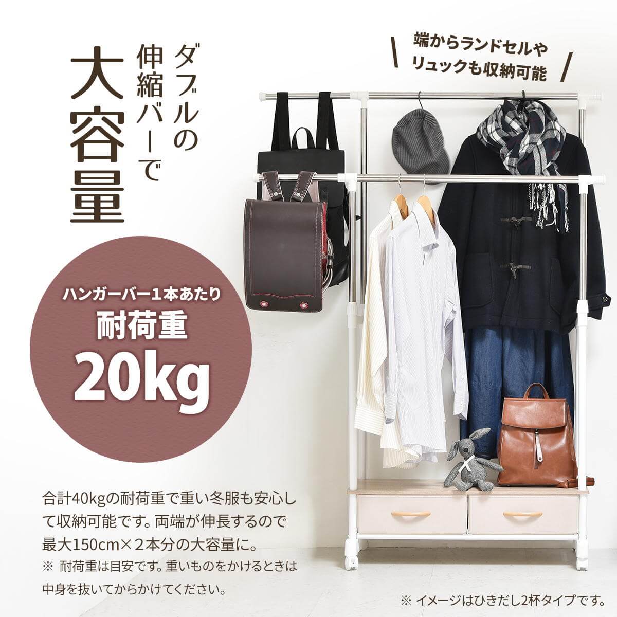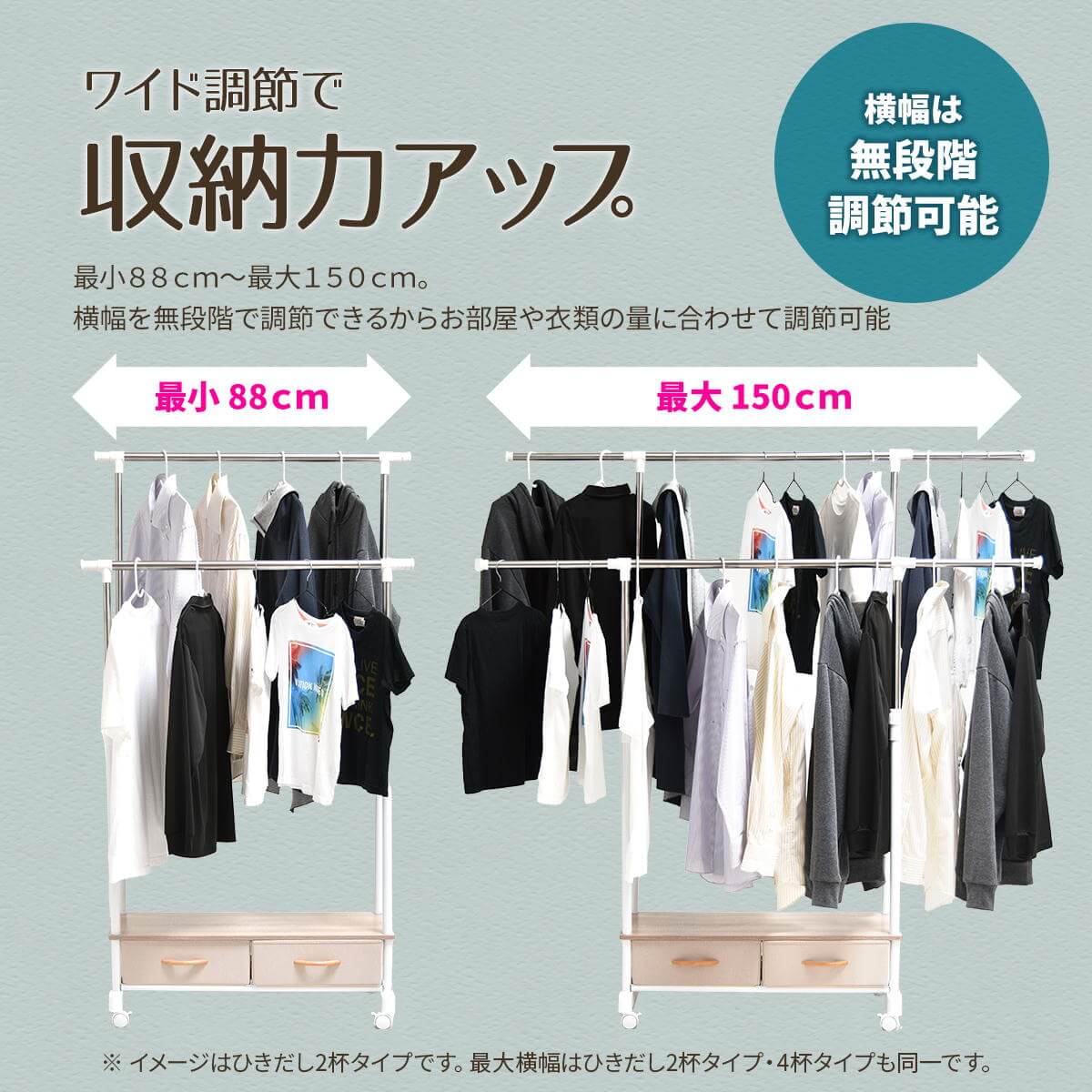 上下左右に伸縮可能で大容量の収納力を備えた最大150cm幅の引き出し収納付きダブルハンガーラックです。