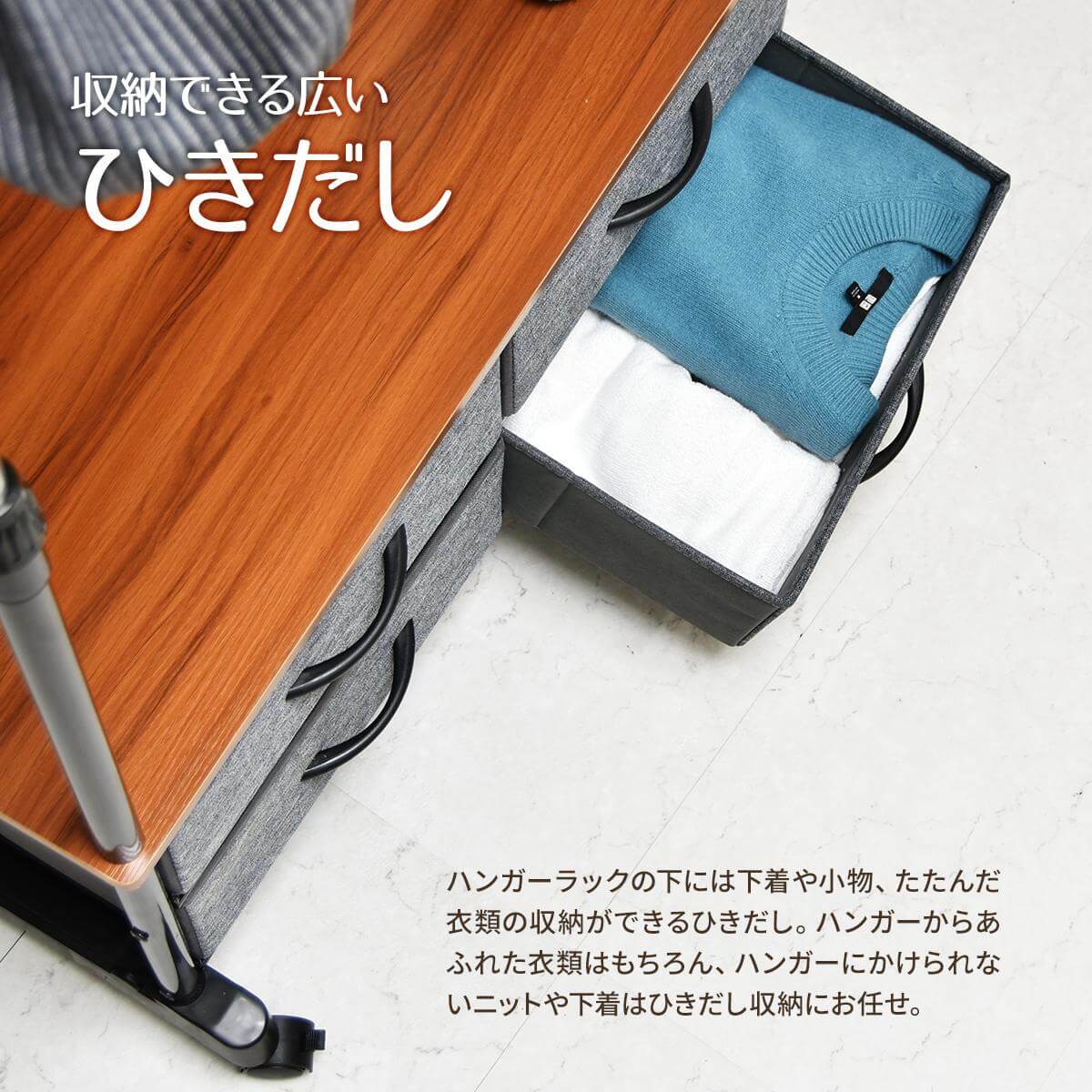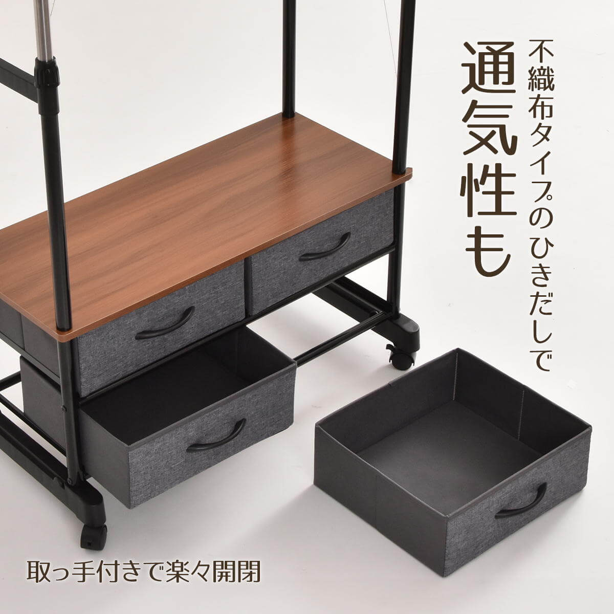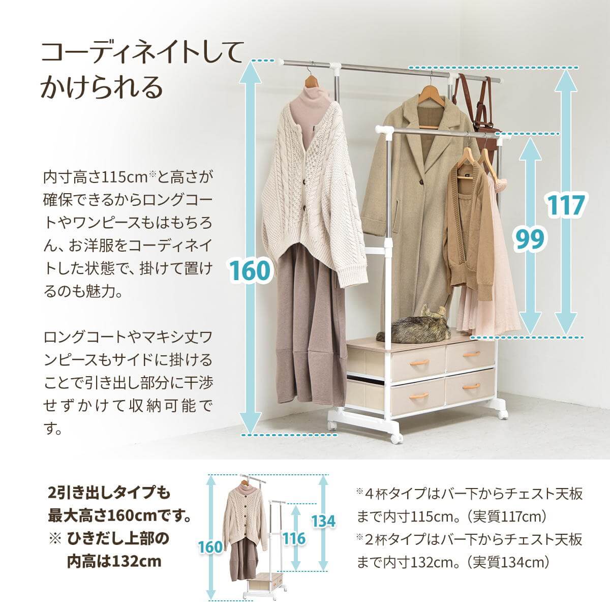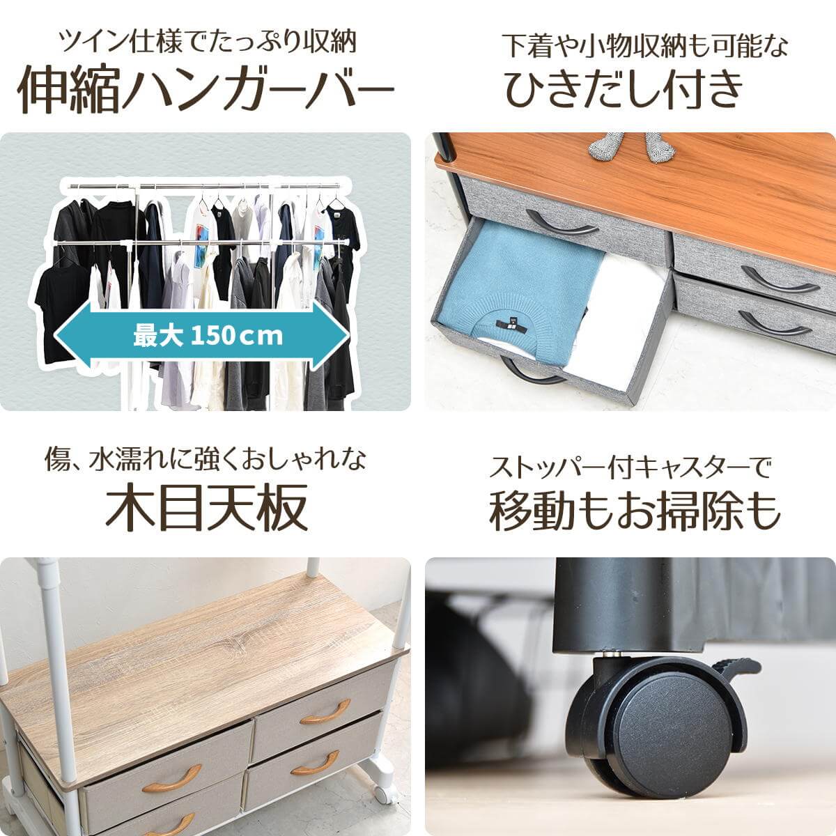 上下左右に伸縮可能で大容量の収納力を備えた最大150cm幅の引き出し収納付きダブルハンガーラックです。