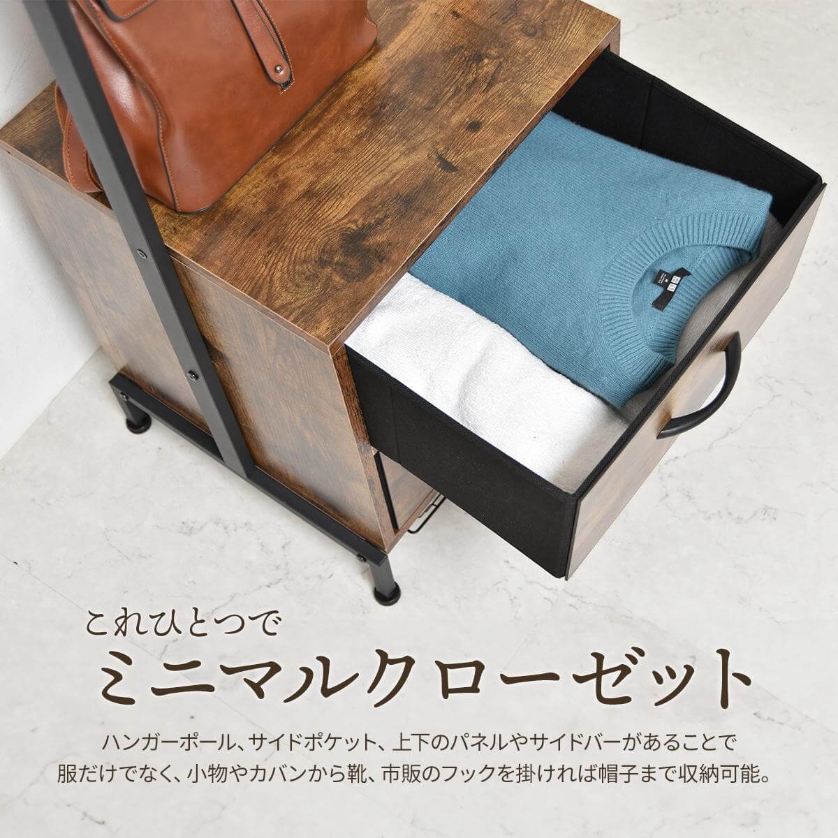 毎日使う服やバッグ、ベルトなどを見せる収納として実用性を兼ねながらもディスプレイを楽しめる収納付きハンガーラックです。