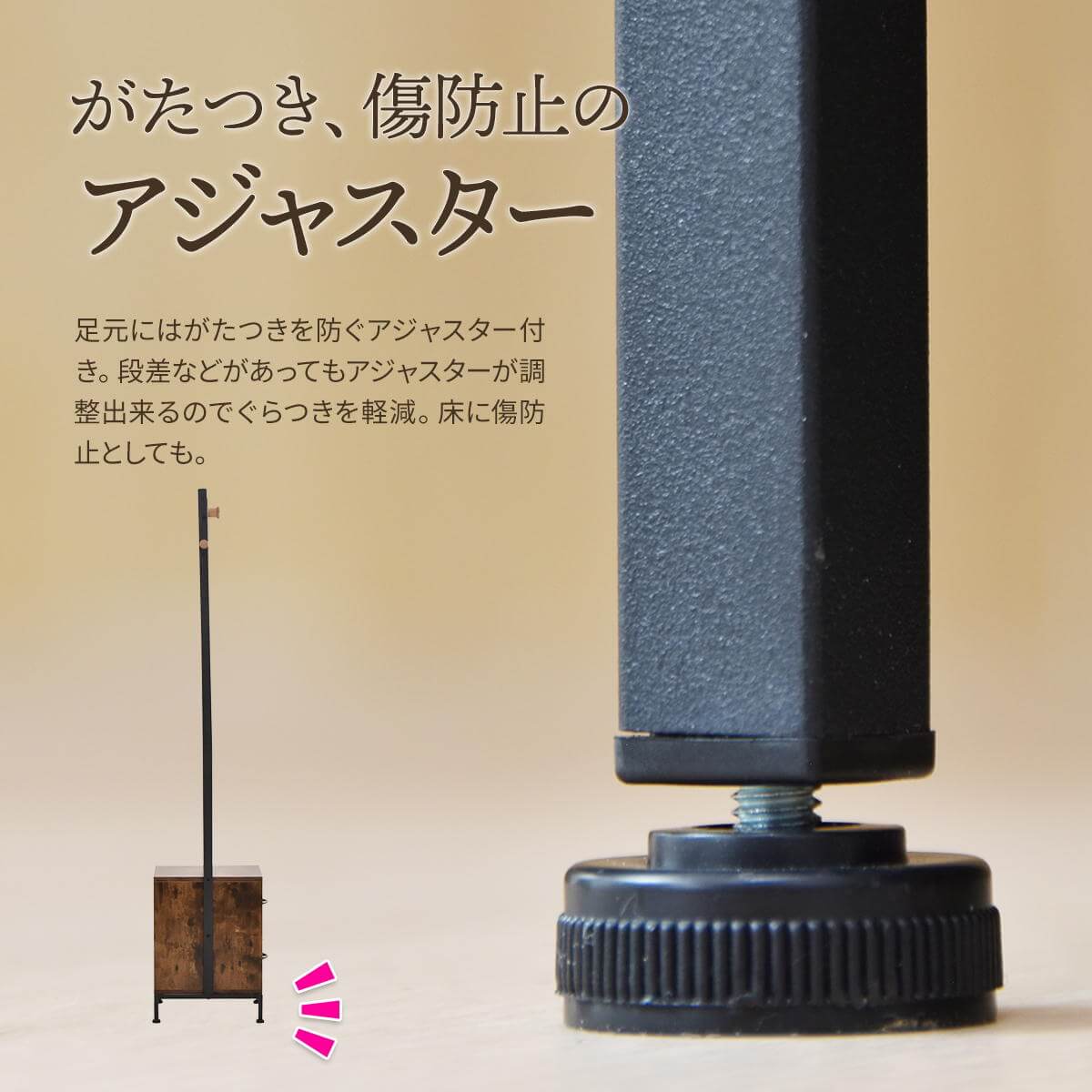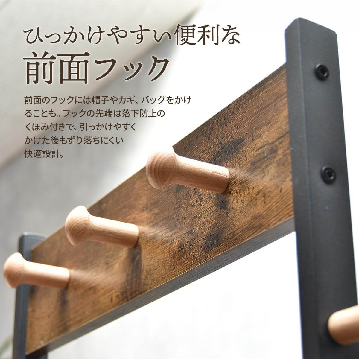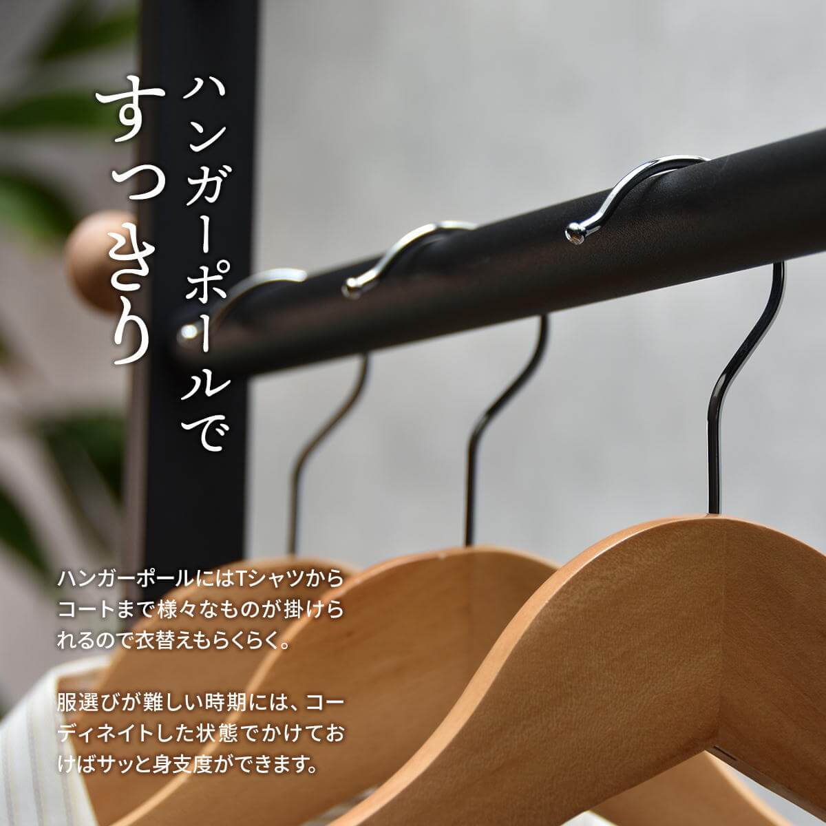 リビングでの使用はもちろん、玄関などスペースの少ない場所への設置もおすすめのコンパクトでスリムなサイズ感のハンガーラックです。