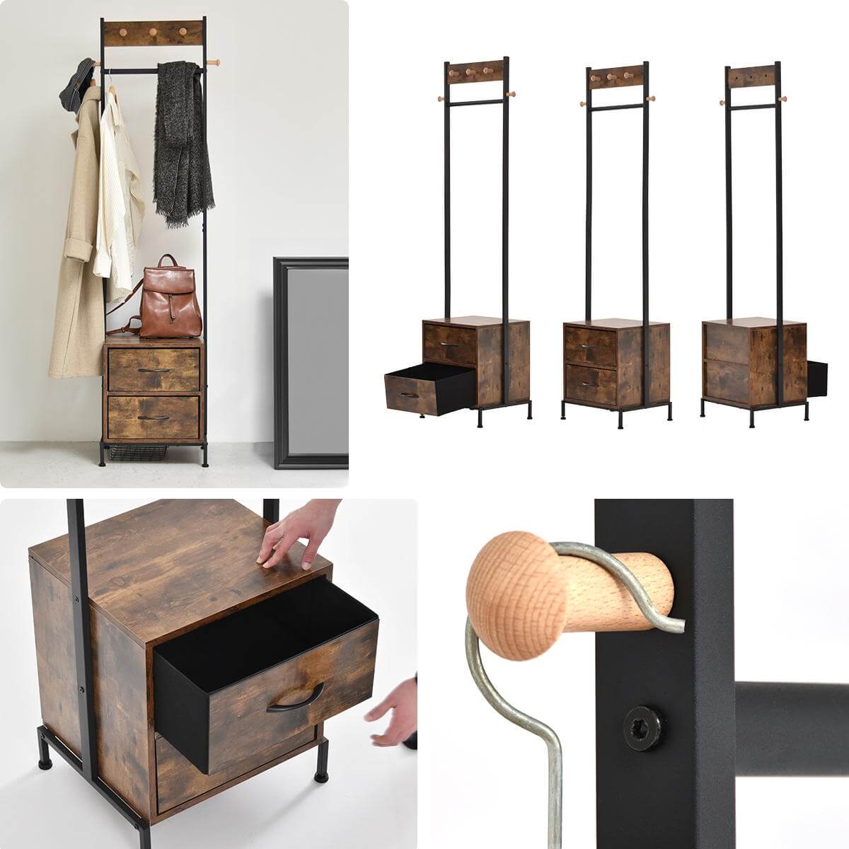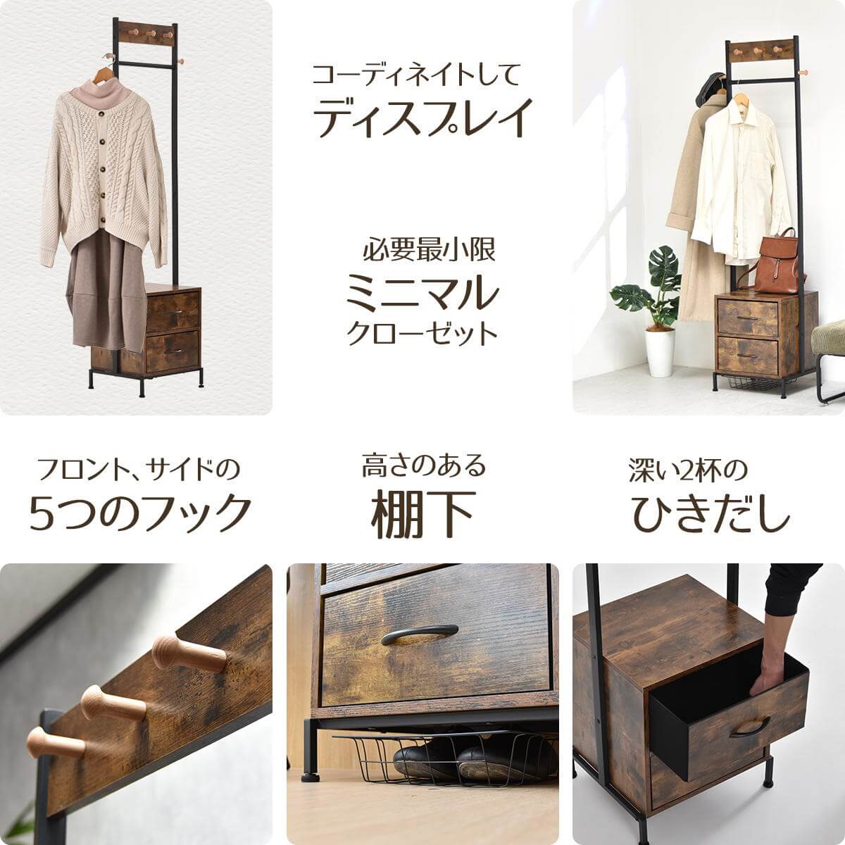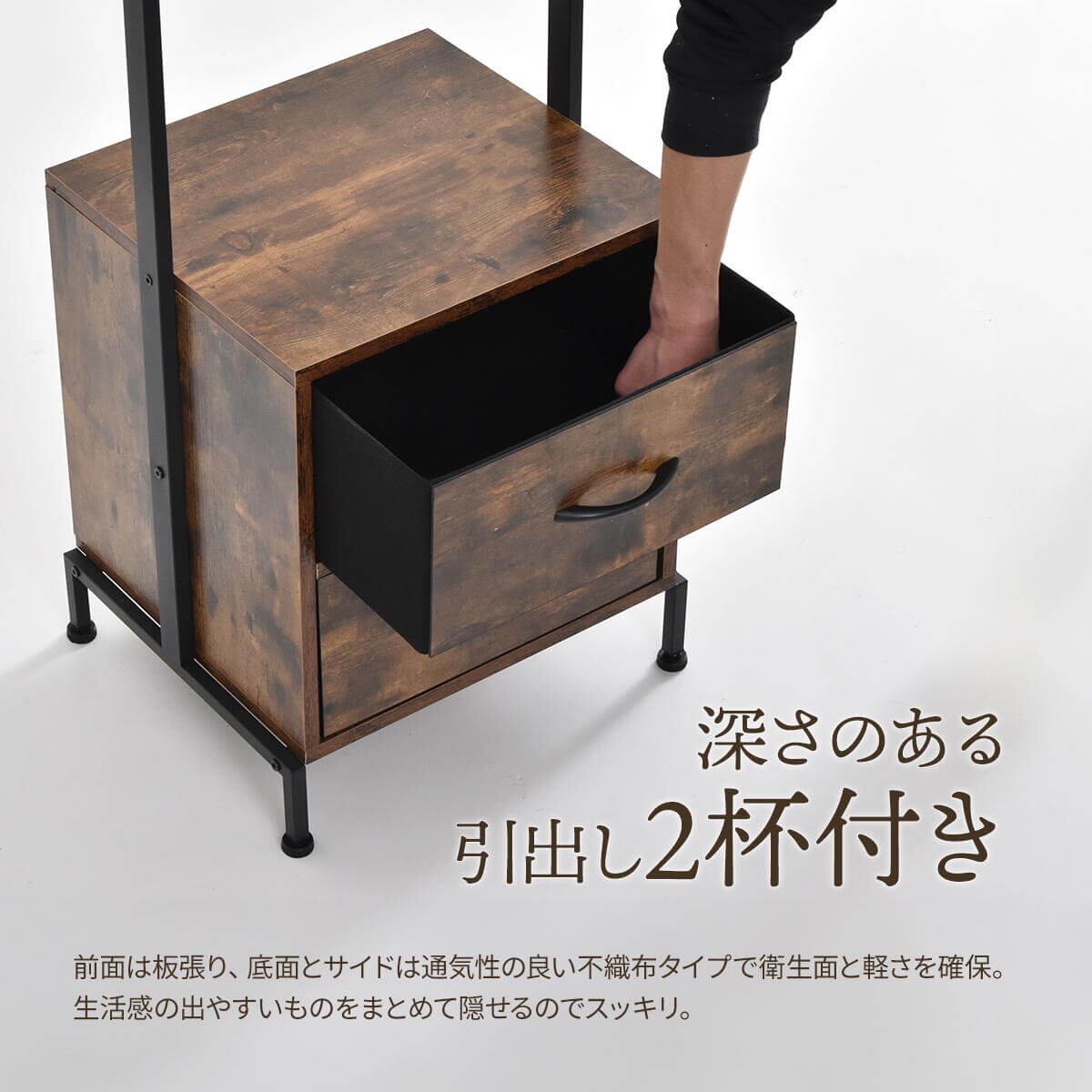前面、左右のフックと引き出し2杯が付いたデザイン性と収納力を備えたハンガーラックです。