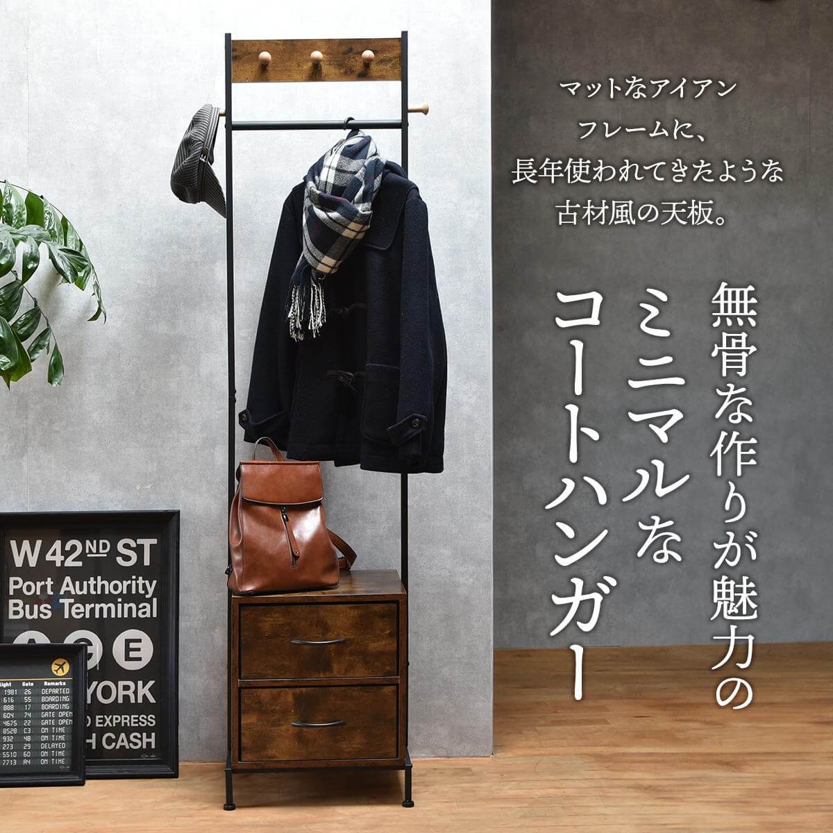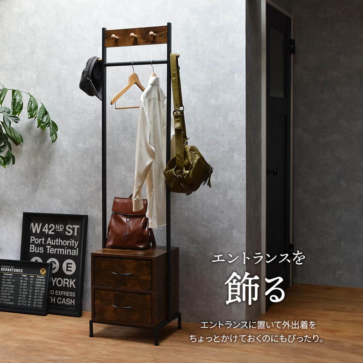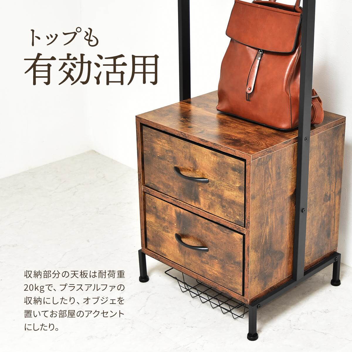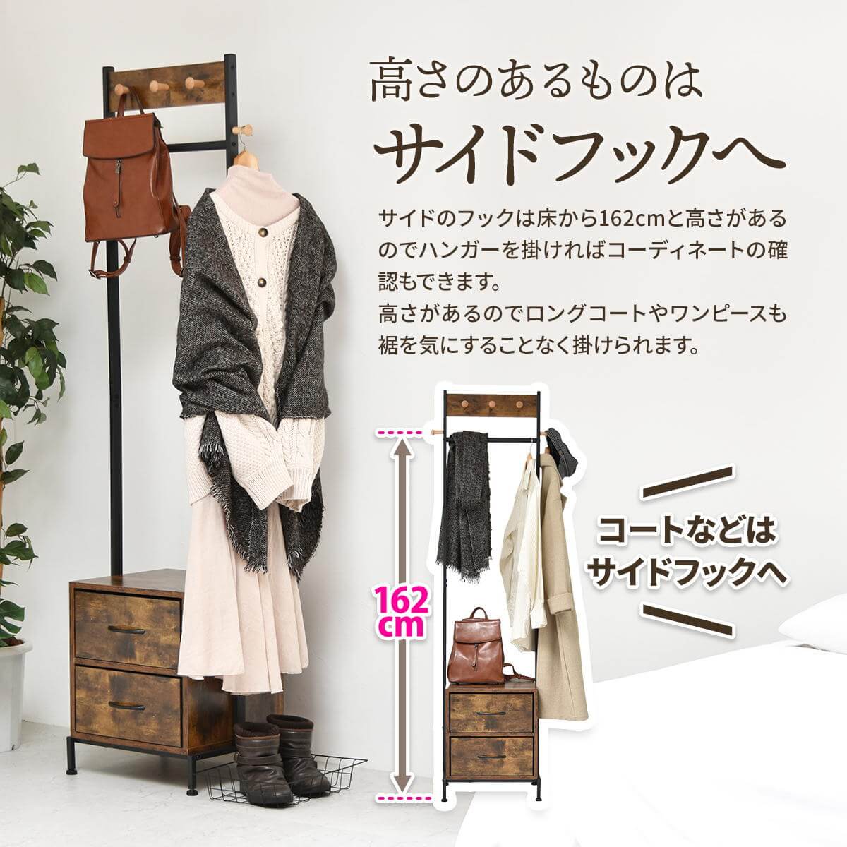 前面、左右のフックと引き出し2杯が付いたデザイン性と収納力を備えたハンガーラックです。
