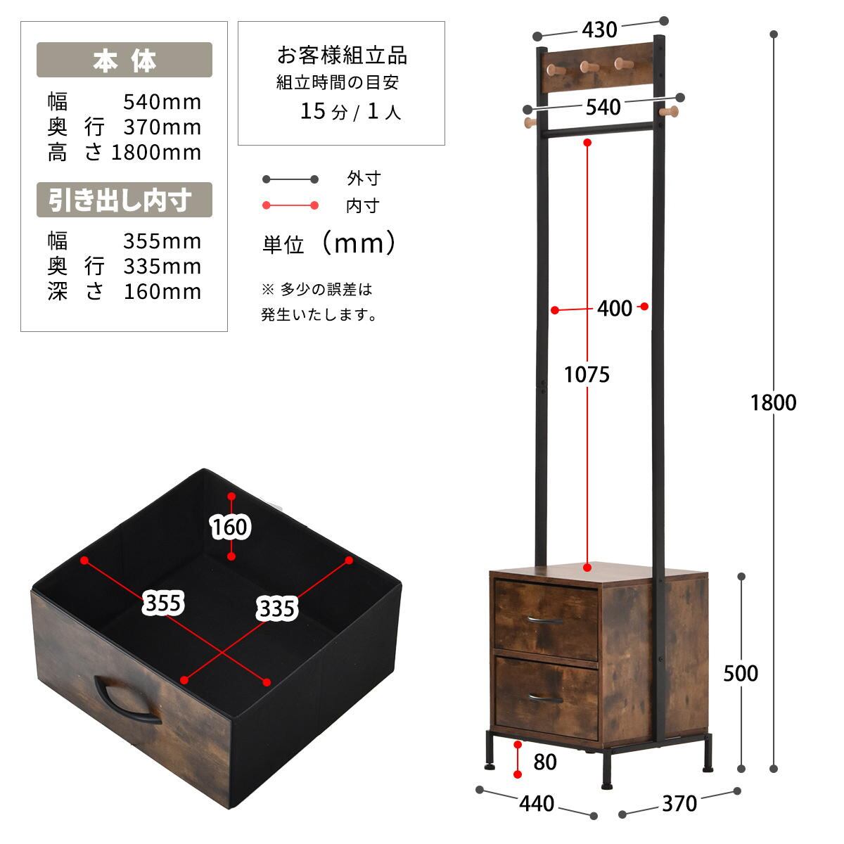 ■耐荷重(約):ハンガーバー20kg、フック1.5kg、天板20kg、引出し(1個あたり)5kg