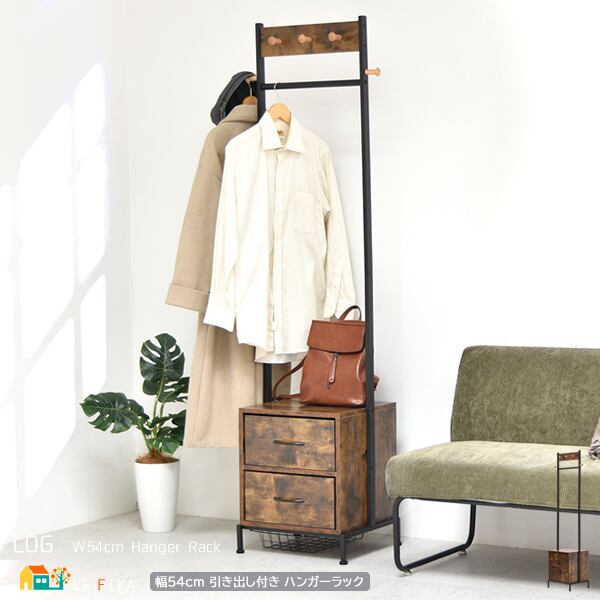 ハンガーラック 収納付きハンガーラック フック付きハンガーラック 54cm幅 ブラウン スリム コンパクト 省スペース 収納チェスト付き 引き出し収納付き おすすめ おしゃれ 北欧 モダン スタイリッシュ レトロ調 玄関収納 リビング収納 コートハンガー 衣類ハンガー 洋服ハンガー バッグ収納 ベルト収納 洋服収納 衣類収納ラック
