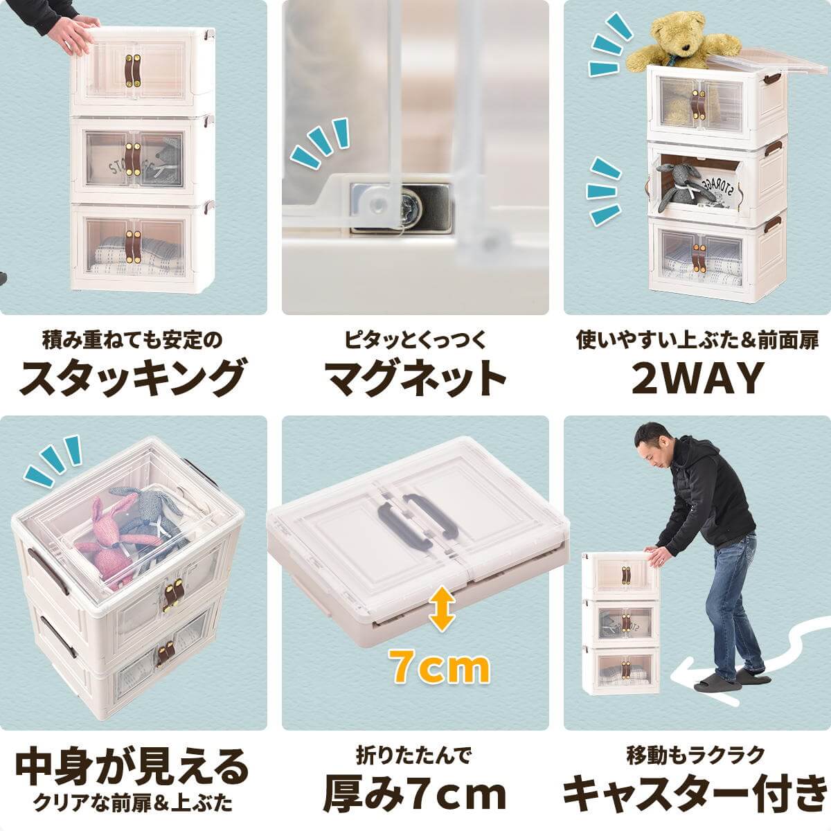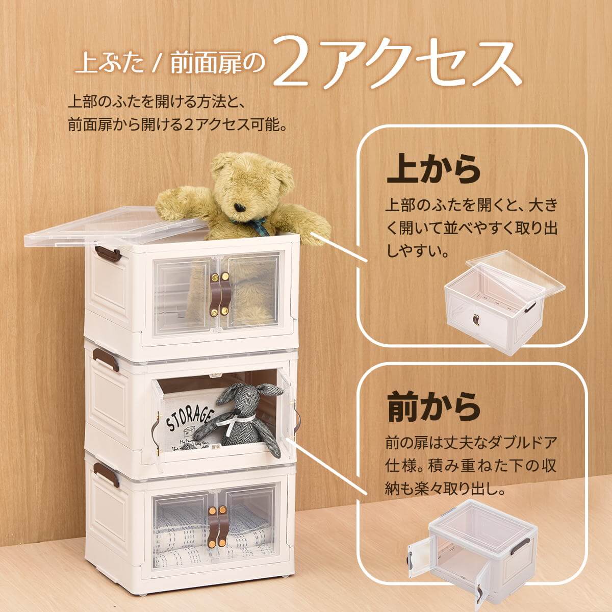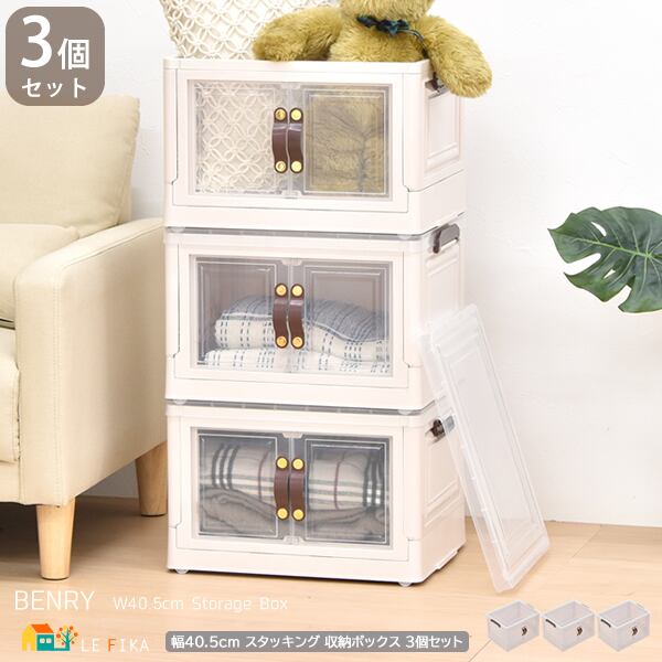 半透明で中身が見える扉付きの積み重ね可能な40.5cm幅の多機能収納ボックス3個セットです。