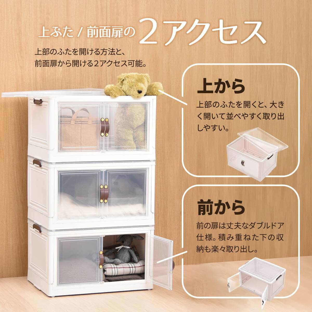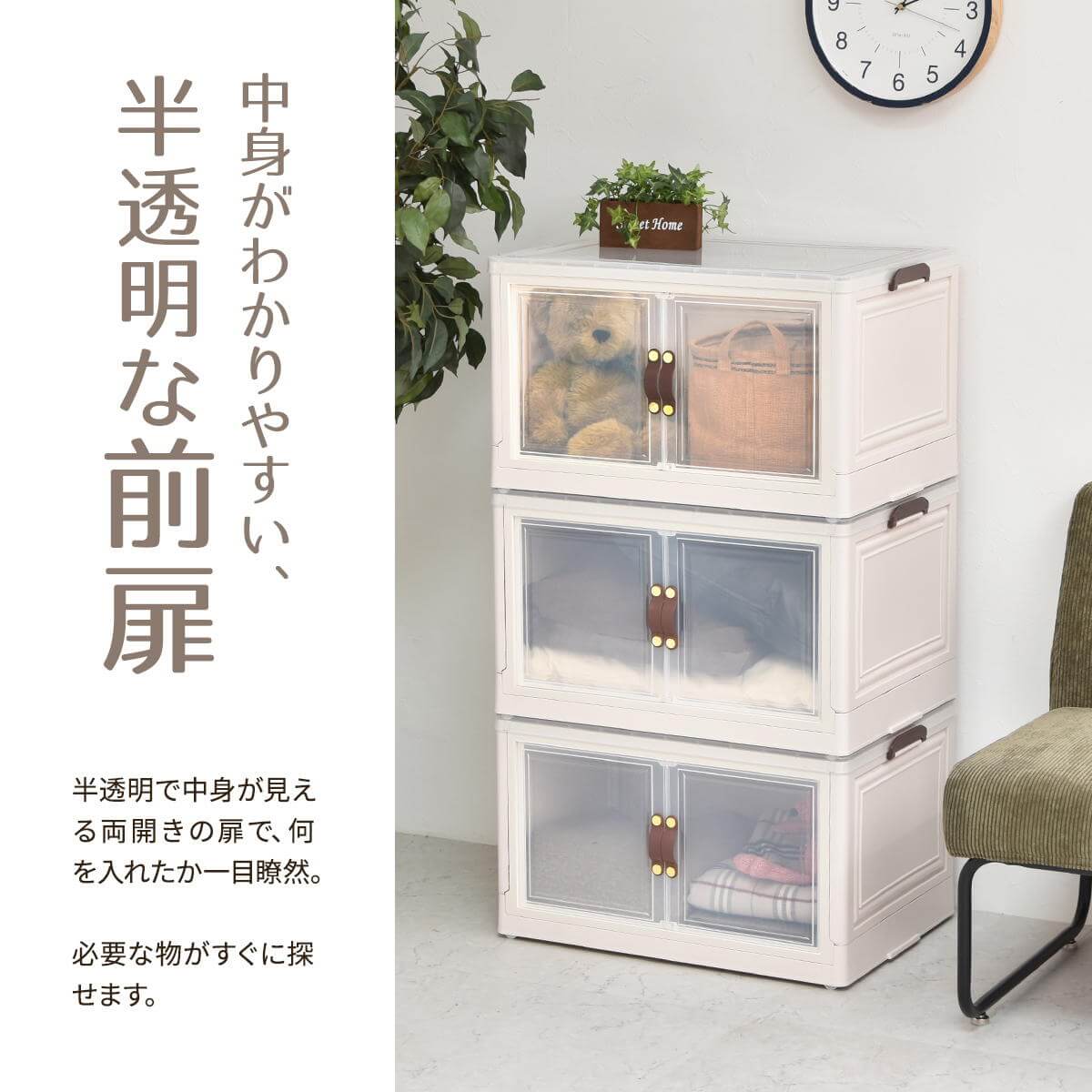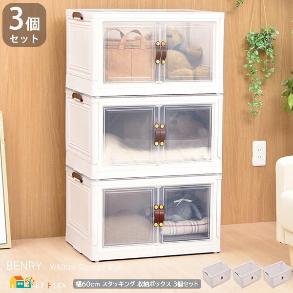 半透明で中身が見える扉付きの積み重ね可能な60cm幅の多機能収納ボックス3個セットです。
