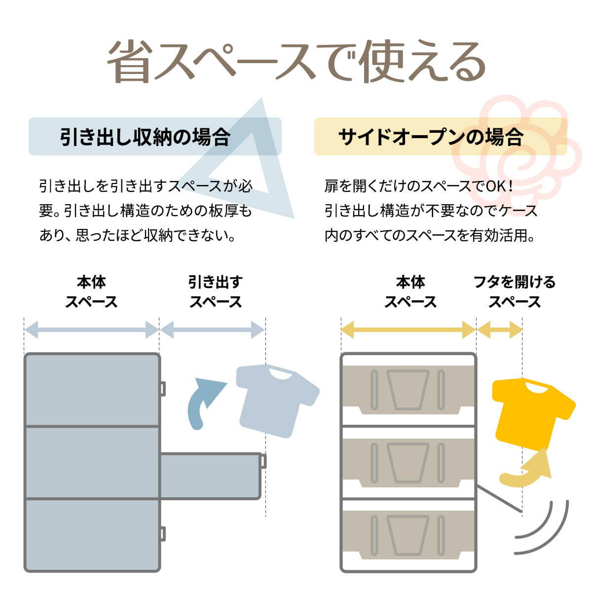 1個ずつの使用はもちろん、3個積み重ねてキャビネットのように設置し、省スペースで使用することも可能です。