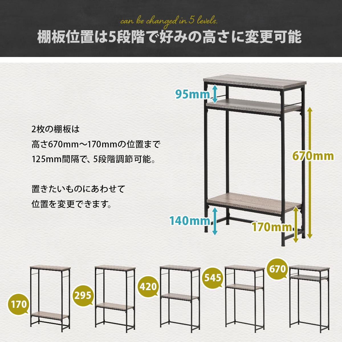 棚板は可動棚仕様で取り付け位置は5か所の中からお好みに合わせて選択頂けます。