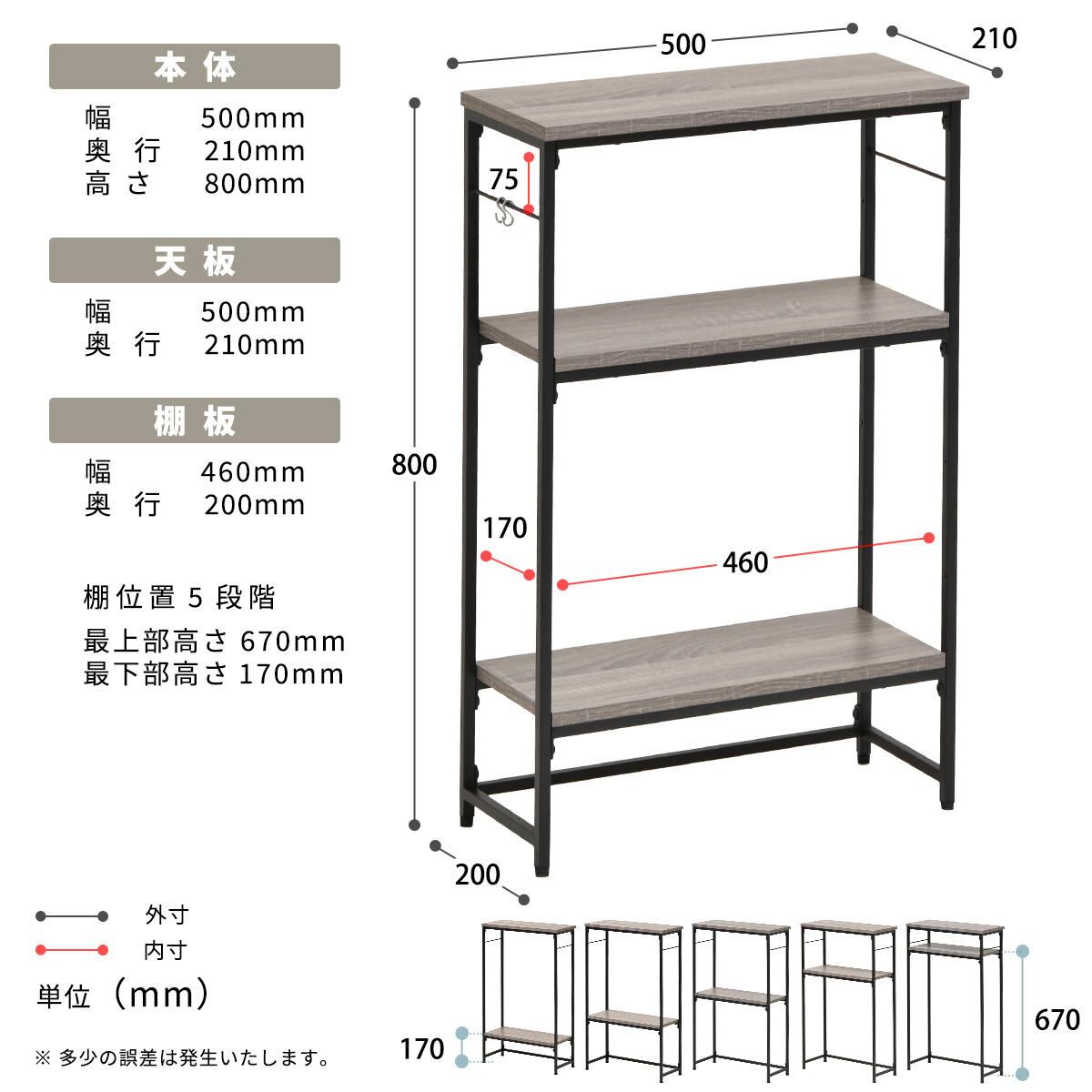 ■耐荷重(約):天板25kg、棚板15kg、フック0.3kg