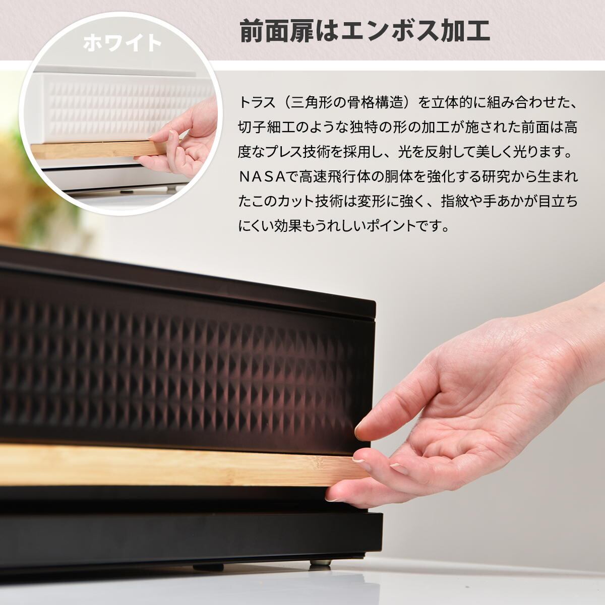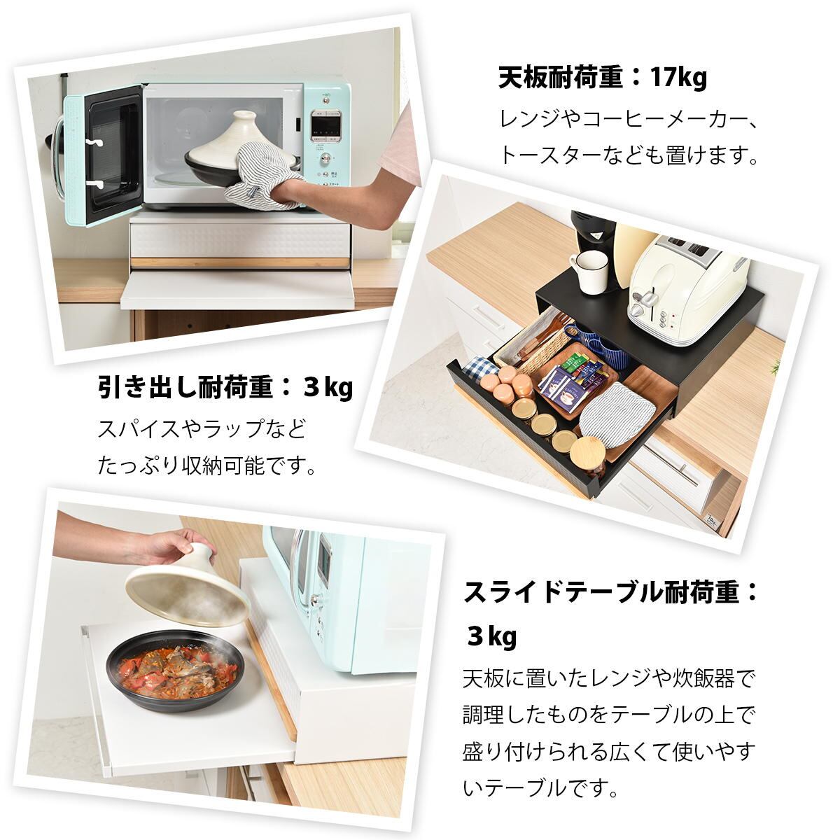 天板耐荷重は(約)17kgで、オーブンレンジの下にも設置可能なので、レンジや家電周りにひろびろ作業スペースを作って家事効率をアップしてくれます。
