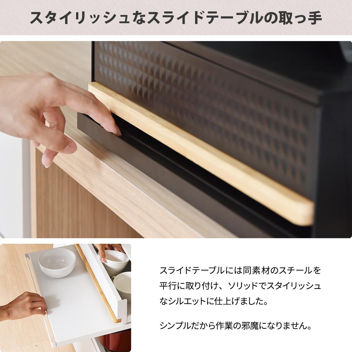 下段はレンジ調理の時やご飯をよそう時にあると便利な作業台で、上段は小物を収納できる便利な引き出し付きなので、ラップやミトン、カトラリー類を収納可能です。