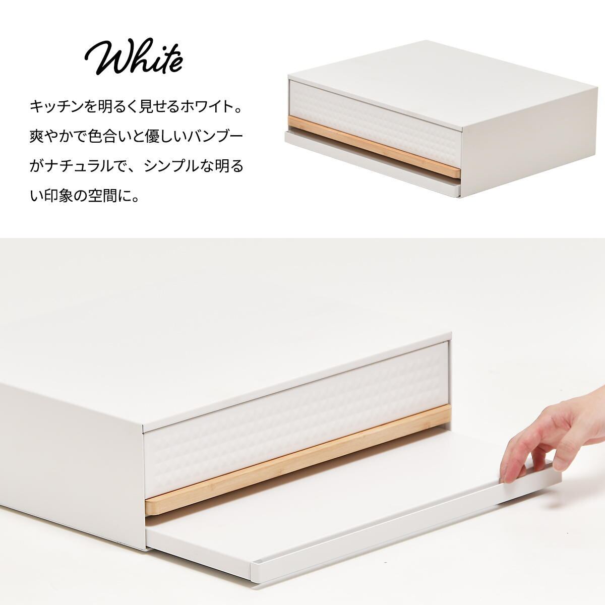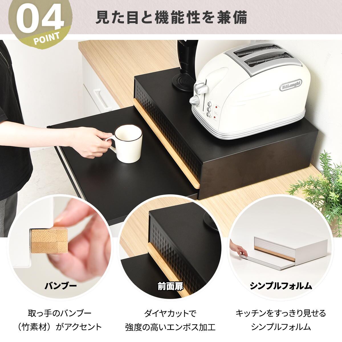 普段は中に収めておいて、必要な時だけ引き出せるので省スペースでの設置が可能で、電子レンジや炊飯器の下に設置すれば必要な時に便利な作業スペースがつくれます。