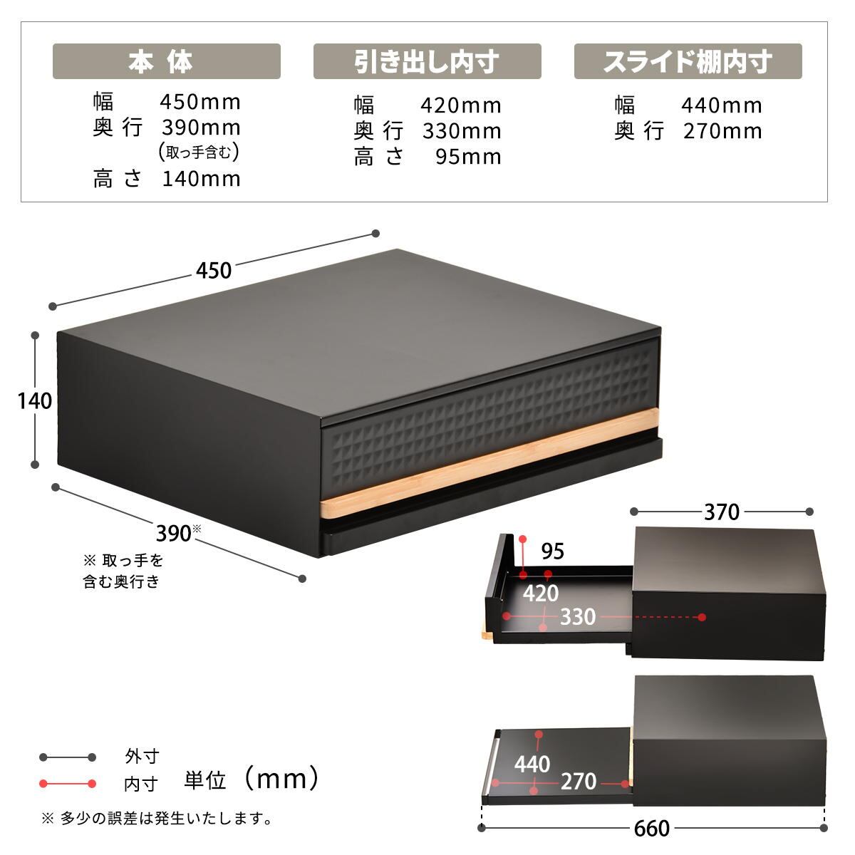 ■耐荷重(約):天板17kg、引出し3kg、スライド3kg