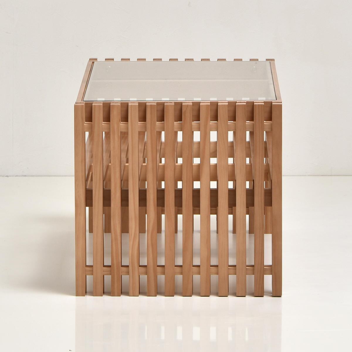 サイドの縦格子とガラスの天板、棚板の組み合わせが美しく光を透過する上品な印象のテーブルです。