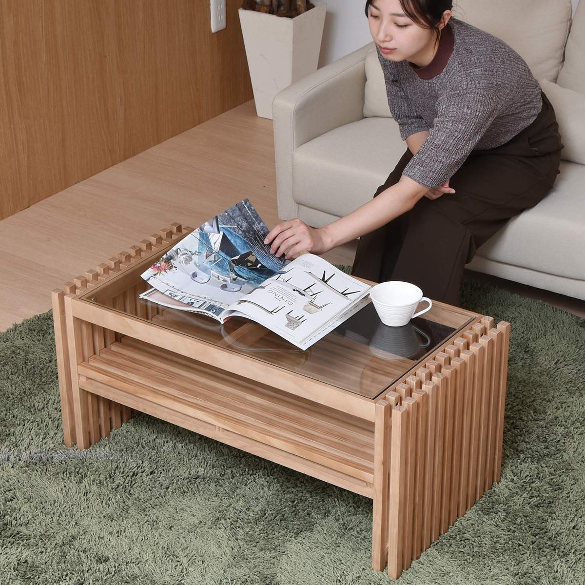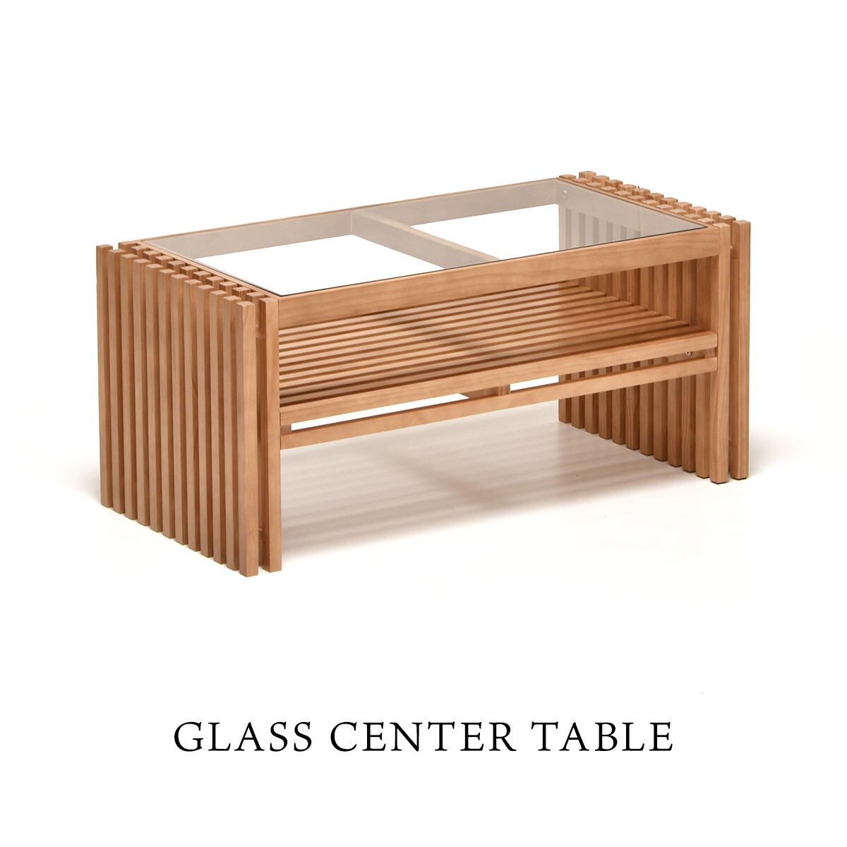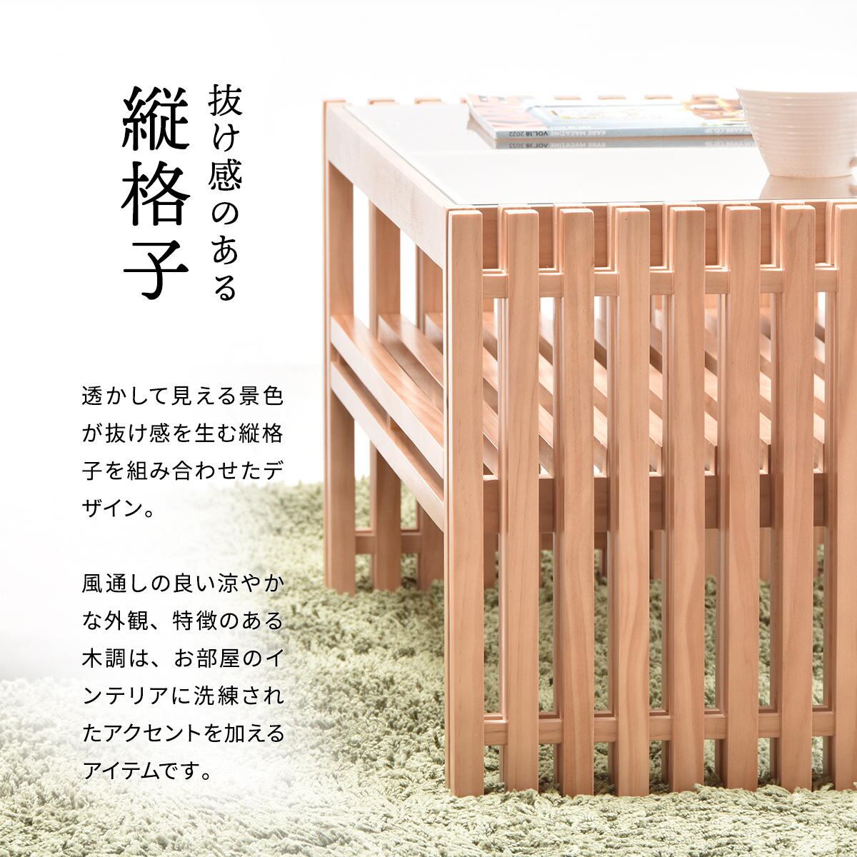 透かして見える景色が抜け感を生む縦格子を組み合わせたデザインの84cm幅のガラス天板のセンターテーブルです。