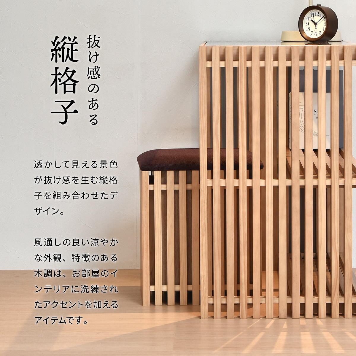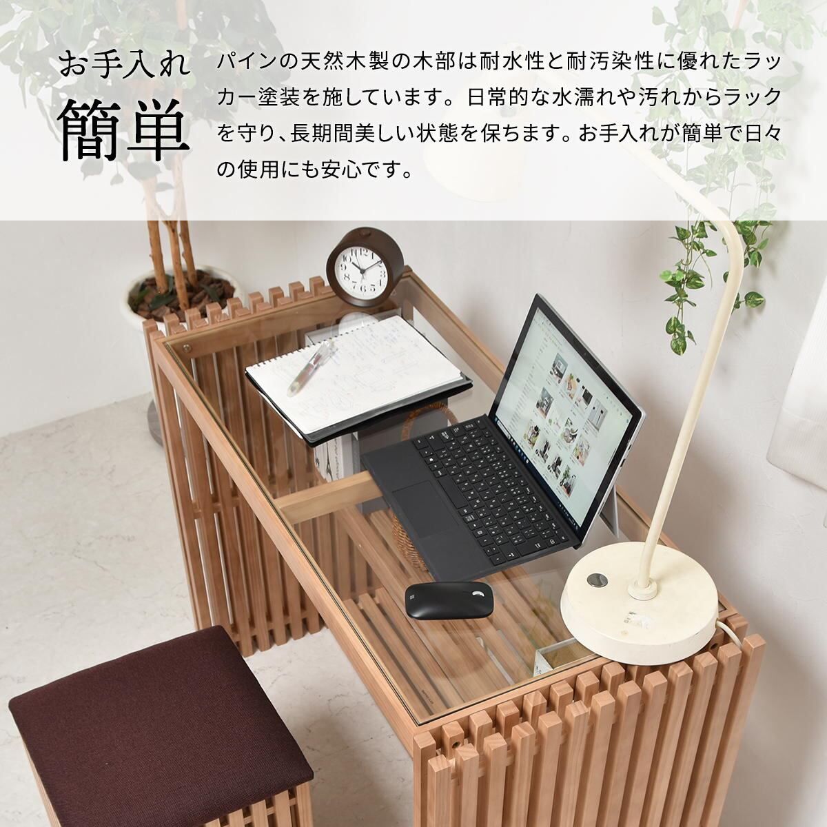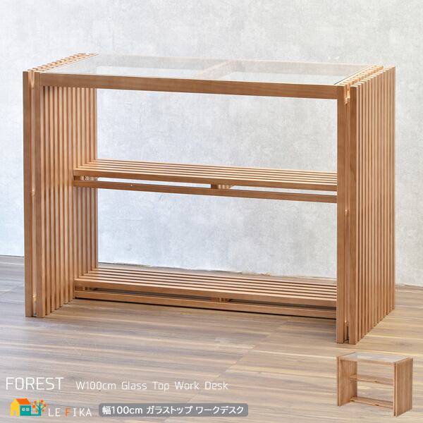 透かして見える景色が抜け感を生む縦格子を組み合わせたデザインの100cm幅のガラス天板のデスクです。