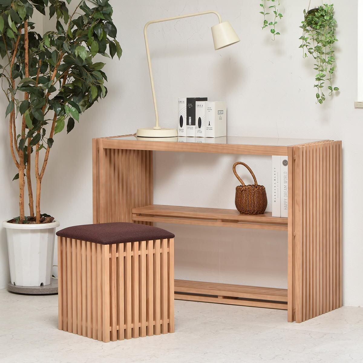 サイドの縦格子とガラスの天板、棚板の組み合わせが美しく光を透過する上品な印象のワークデスクです。