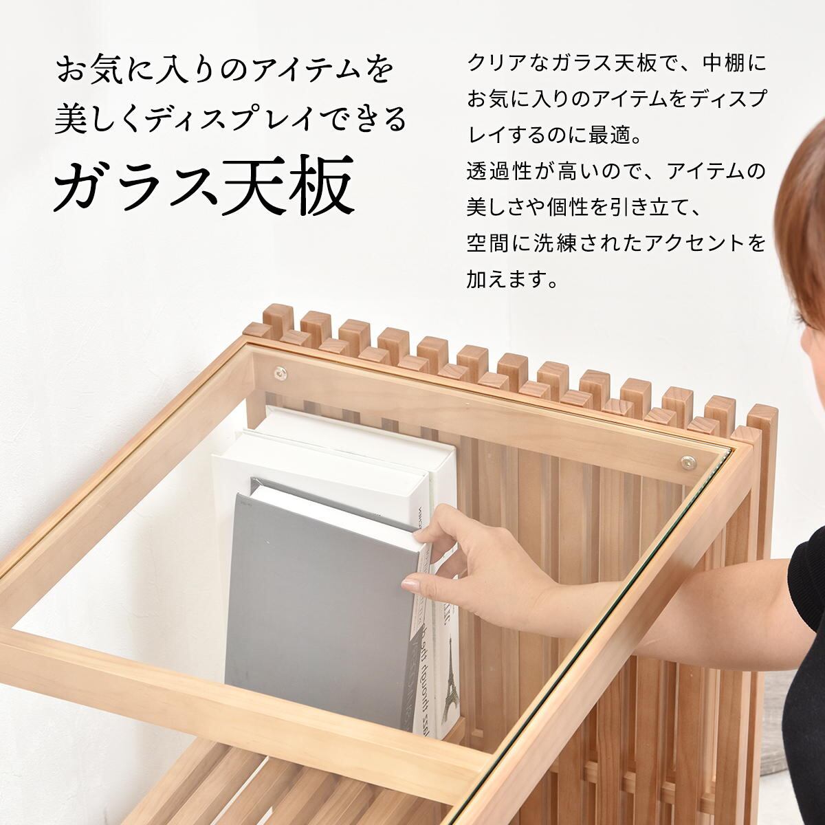 クリアなガラス天板なので、中棚にはお気に入りの物をディスプレイするなどのご使用方法もオススメです。