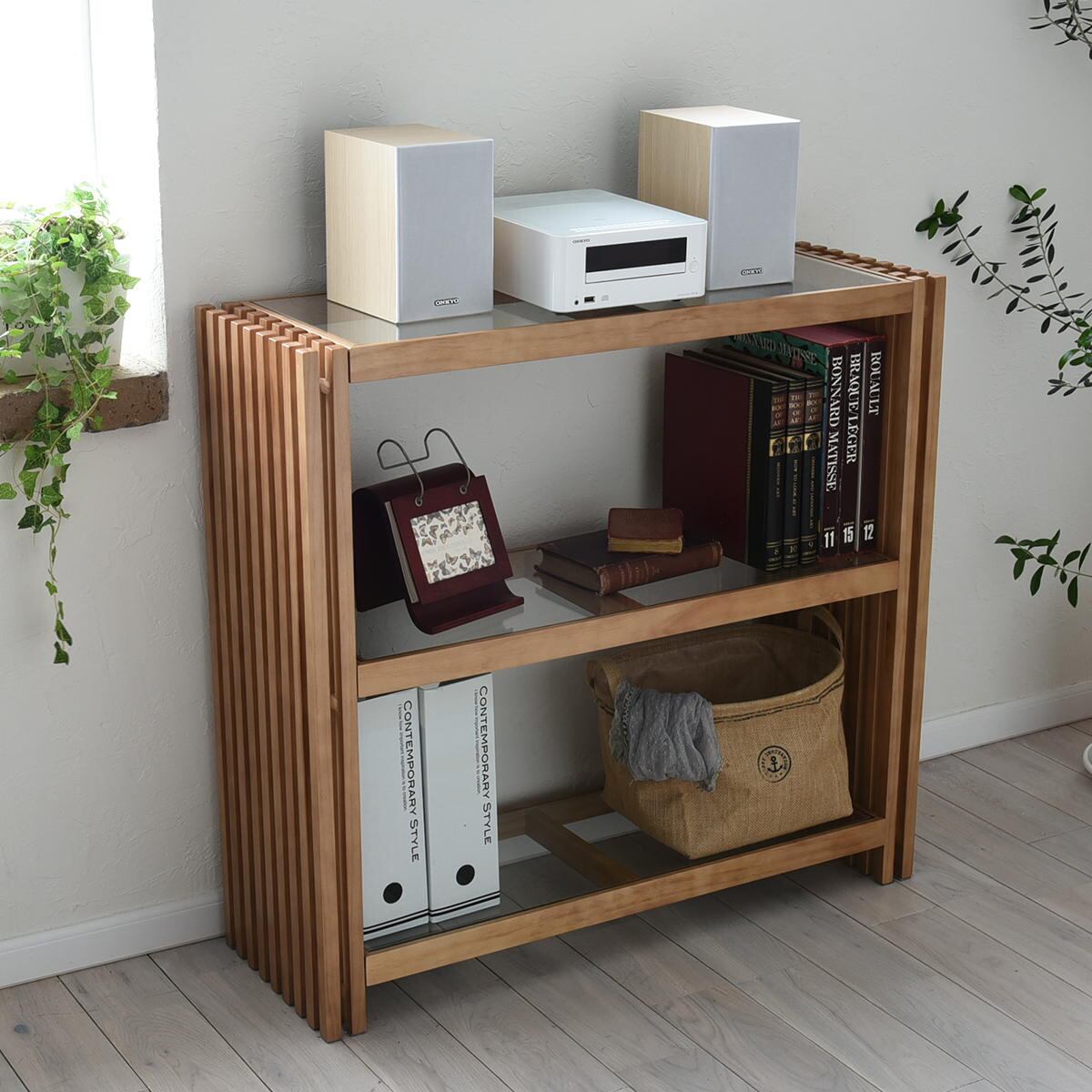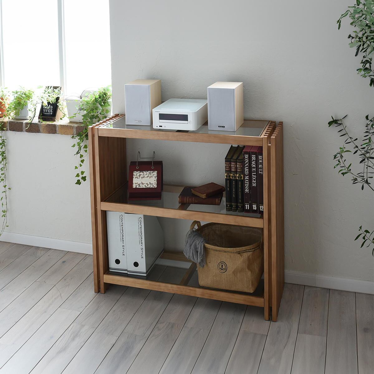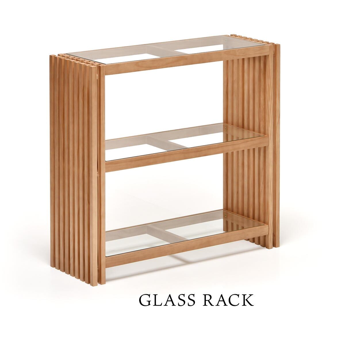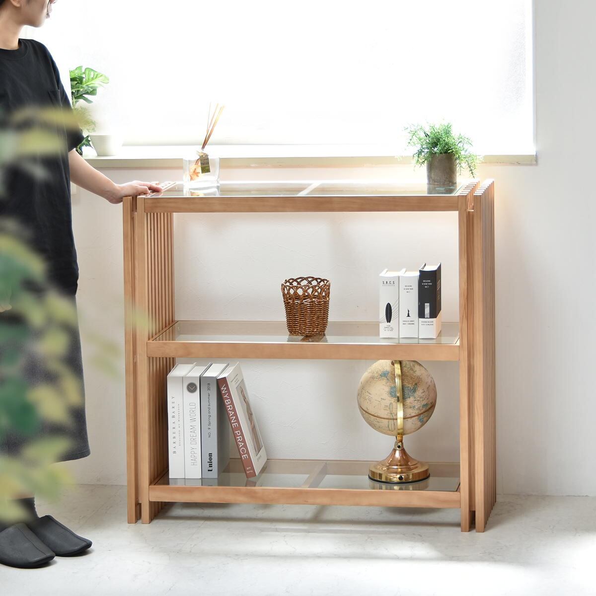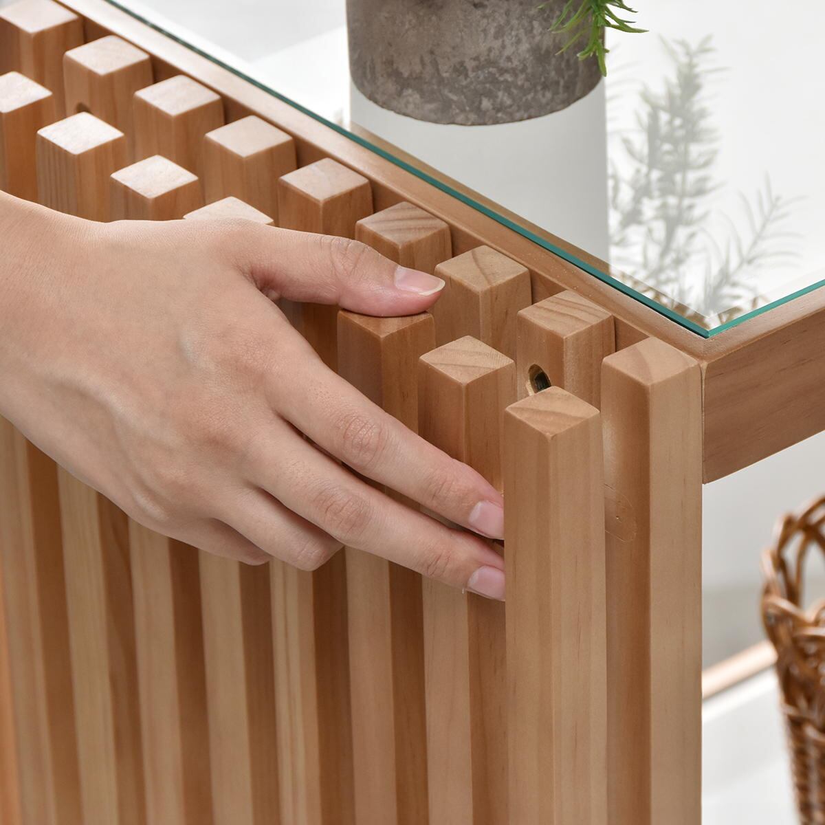 サイドの縦格子とガラスの天板、棚板の組み合わせが美しく光を透過する上品な印象の収納棚です。
