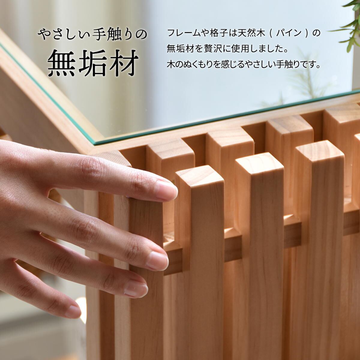 フレームや格子は天然木(パイン材)の無垢材を使用している贅沢な仕上がりの収納ラックです。