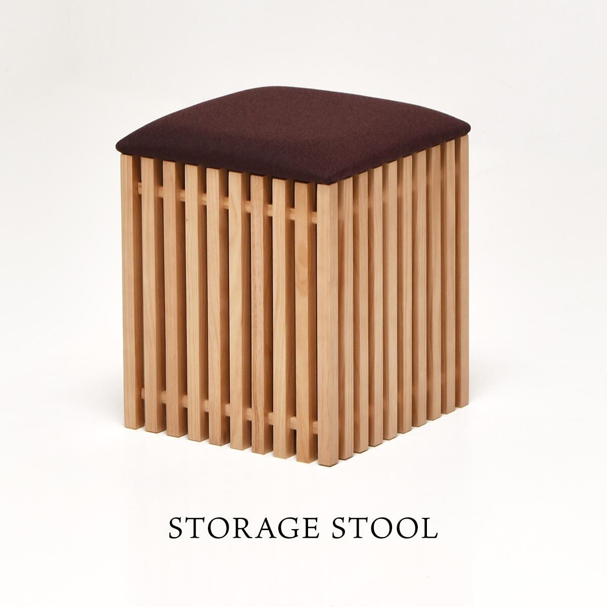 サイドの縦格子とファブリックの座面の組み合わせが美しい収納付きスツールです。