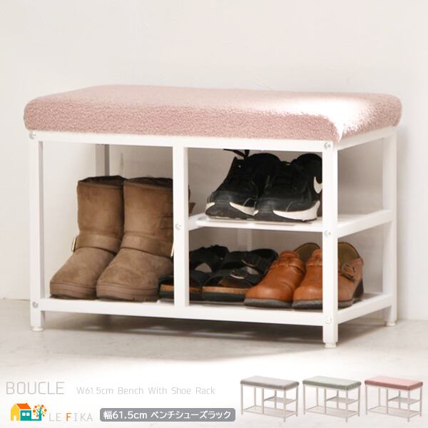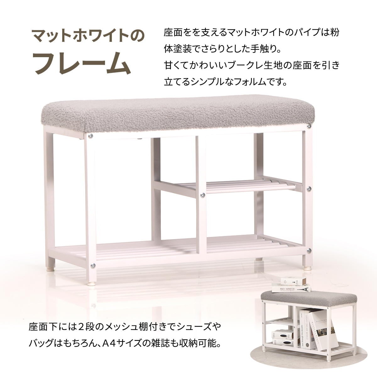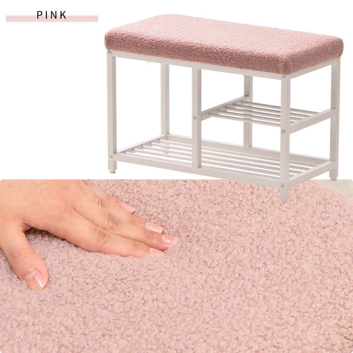 収納付きベンチ 61.5cm幅 グレー ピンク ライトグレー シューズラック付きベンチ 玄関ベンチ リビングベンチ 室内ベンチ ブークレ生地使用 スチールフレーム おすすめ おしゃれ 北欧 モダン スタイリッシュ 背もたれ無し 肘掛け無し 肘置き無し アームレスチェア スツール ベンチ 一人用ベンチ 室内用ベンチ ベンチシューズラック 収納ラック付きベンチ 椅子 収納棚付きベンチ
