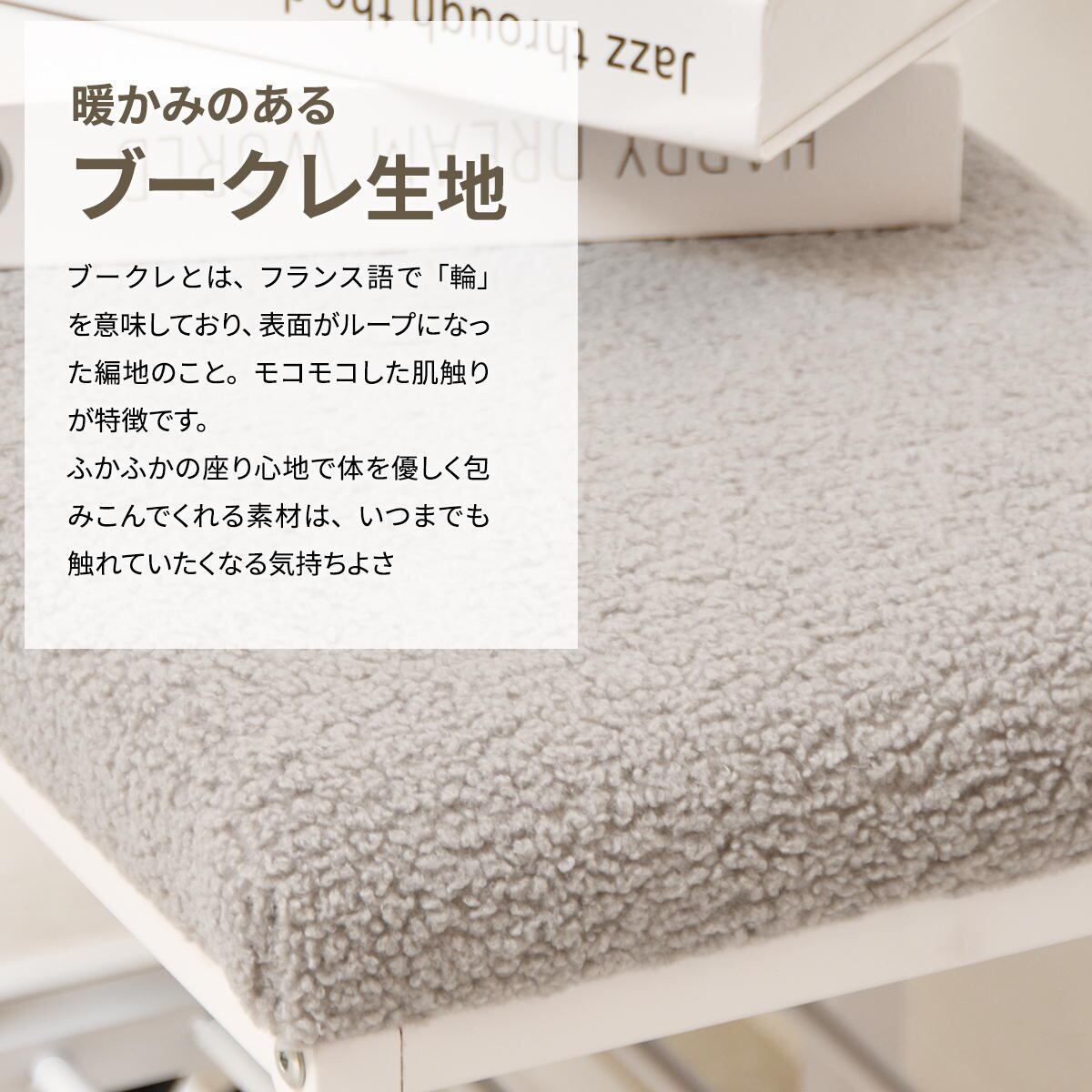 座面はブークレ生地で仕上げており、高密度ウレタンを採用することでふかふかと肌触りが良く、沈み込みすぎず柔らかすぎない座り心地の良いベンチです。