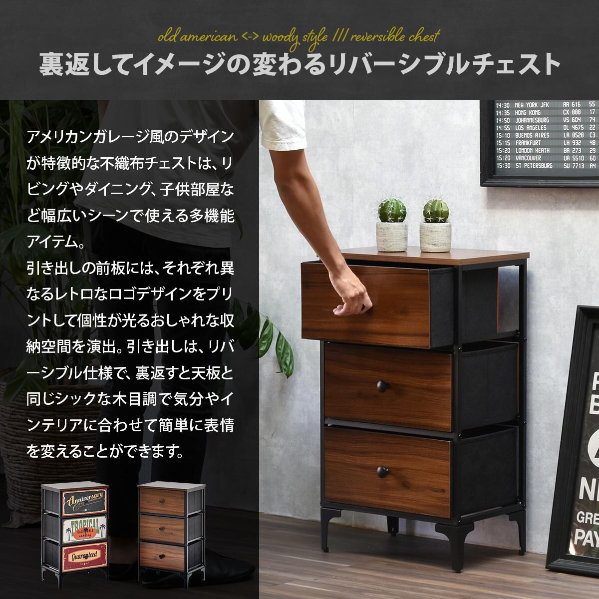 引き出しの前板面はリバーシブル仕様で、片側はそれぞれ異なるレトロなロゴデザインがプリントされた面と、もう一方は天板と同じシックな木目調の仕様で、気分や雰囲気に合わせて表情を変えることができます。