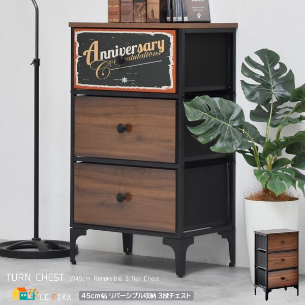 3段 チェスト 45cm幅 ダークブラウン 3段チェスト 収納チェスト 三段収納チェスト 引き出しリバーシブル仕様 不織布 リビング収納 おすすめ おしゃれ ミッドセンチュリー アメリカンスタイル 3段引き出し収納付き スチールフレーム ディスプレイラック 収納棚 収納ラック